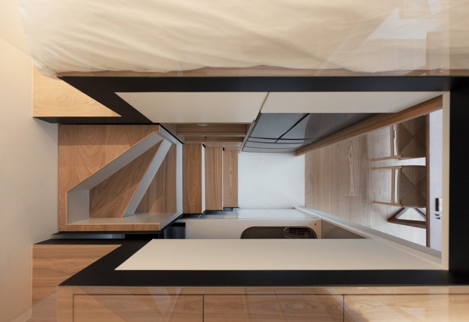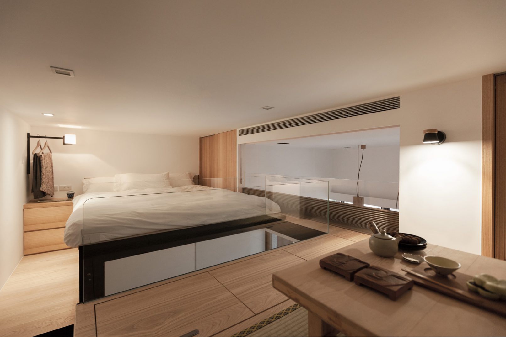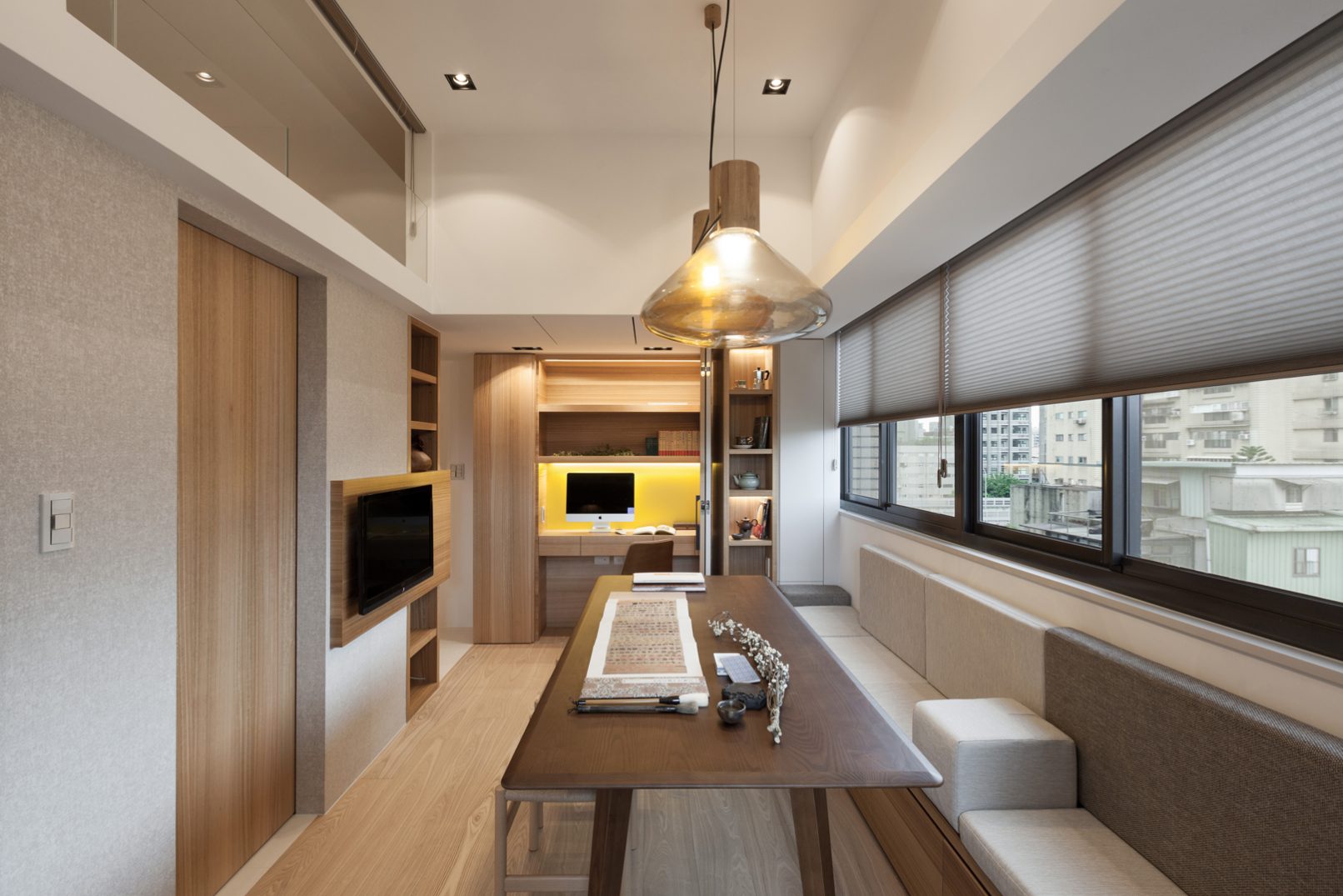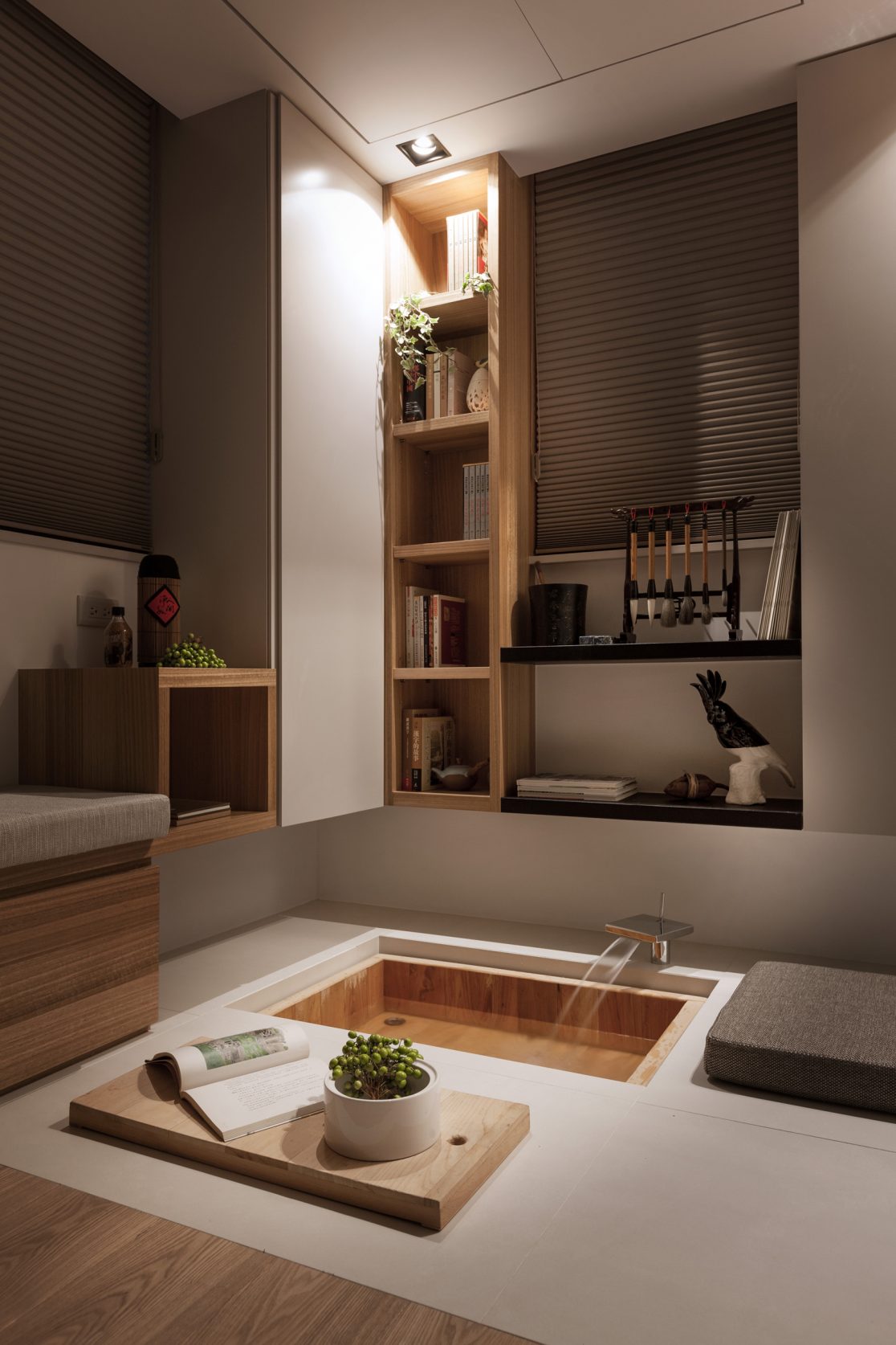 當活在都市裡的空間越來越狹小,我們需要更大膽更豐富的想象力,挑戰空間的限制並解決問題:8坪空間摒掉傳統格局配置,改成長形開放式公共空間,不只讓空間感放大,也讓屋主熱愛喝茶、書法、禪修的雅趣融入其中,與明亮自然的色調相呼應;量身訂造的可移動電動樓梯,各種隱藏在意想不到的角落的機關收納,甚至還有隱藏在客廳的泡腳池,以小見大的機能生活,完全實踐在這個簡練住宅裡,更顛覆未來的迷你住宅生活,開拓出另一片創意新天地。