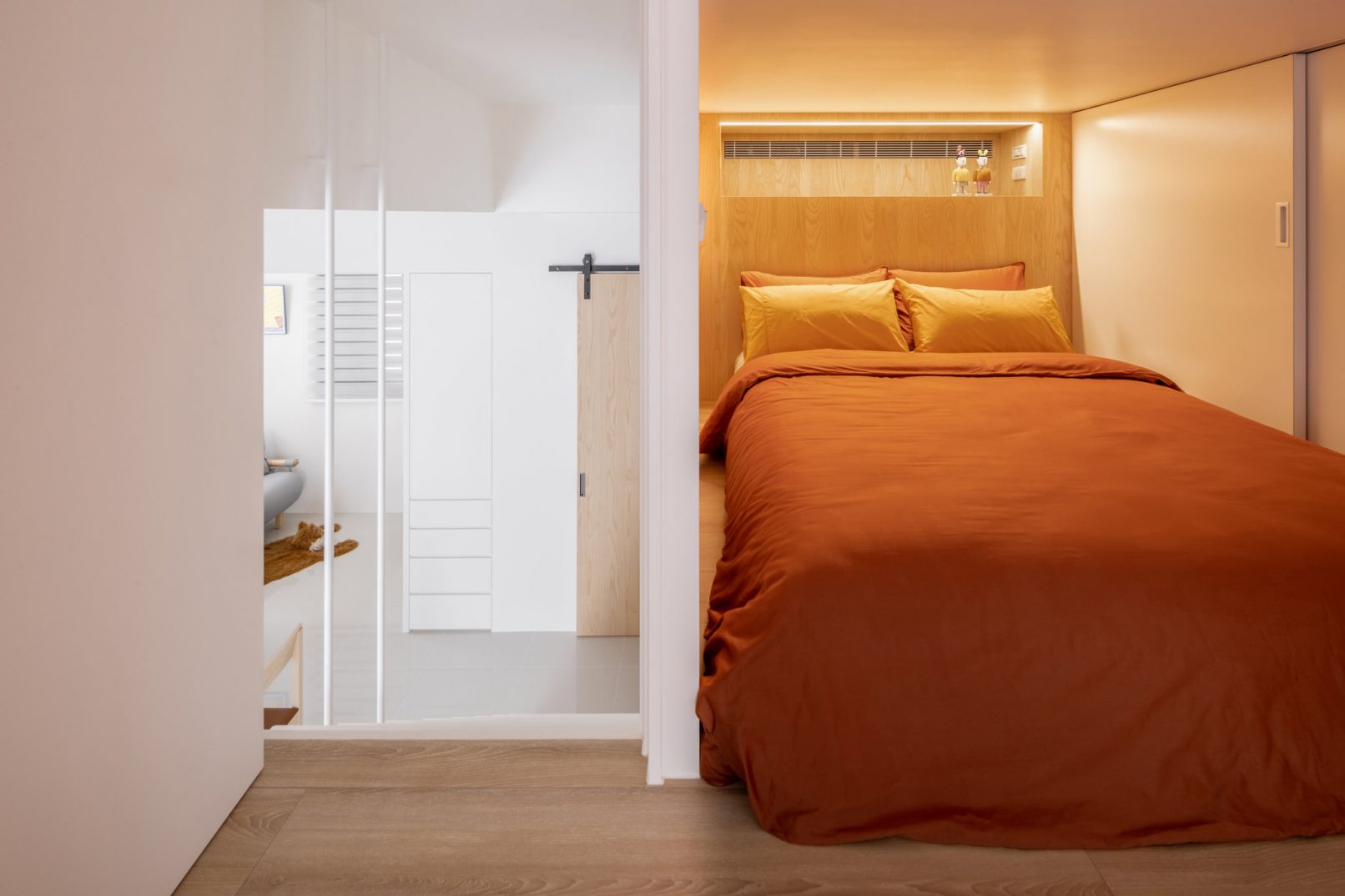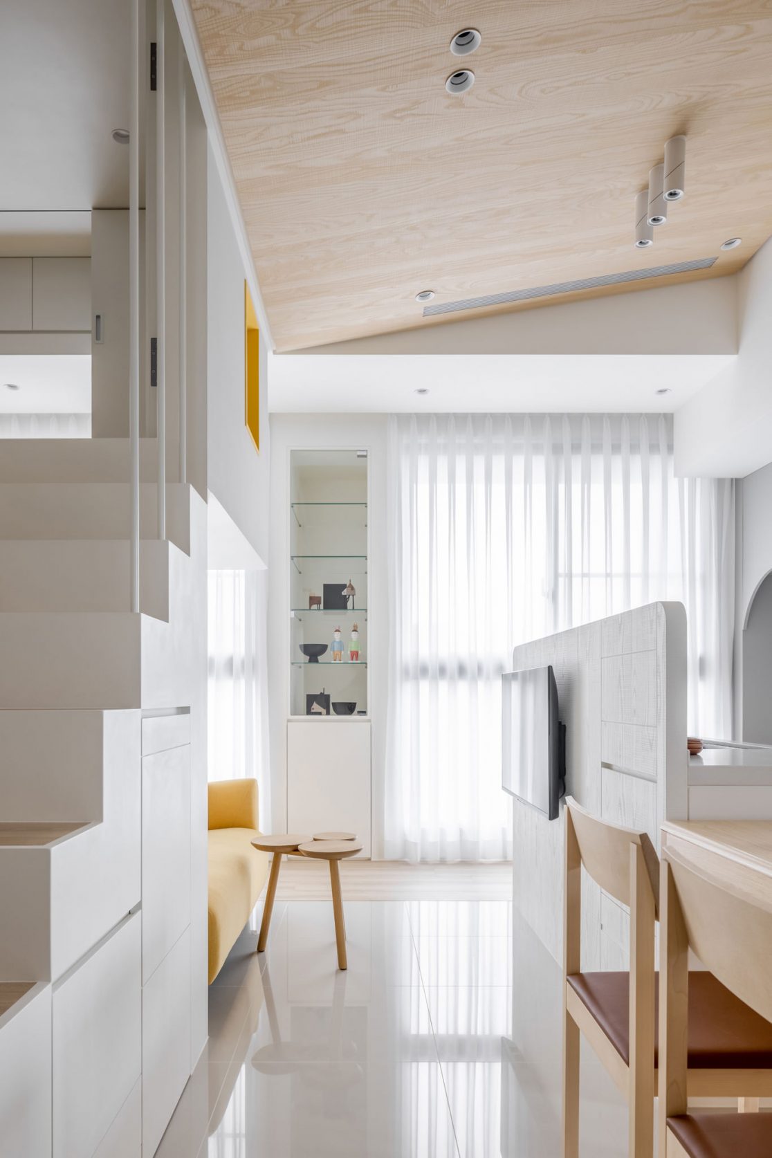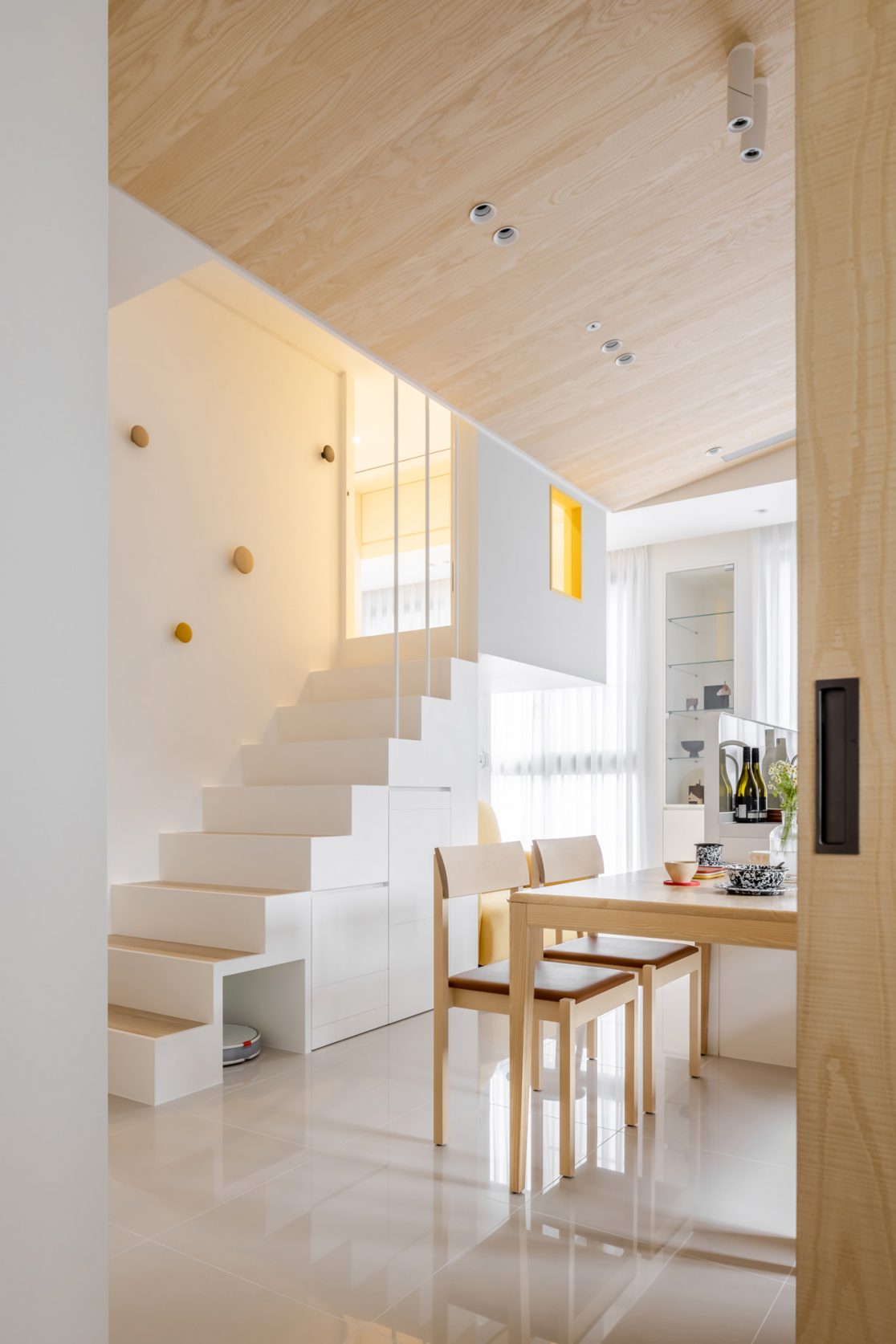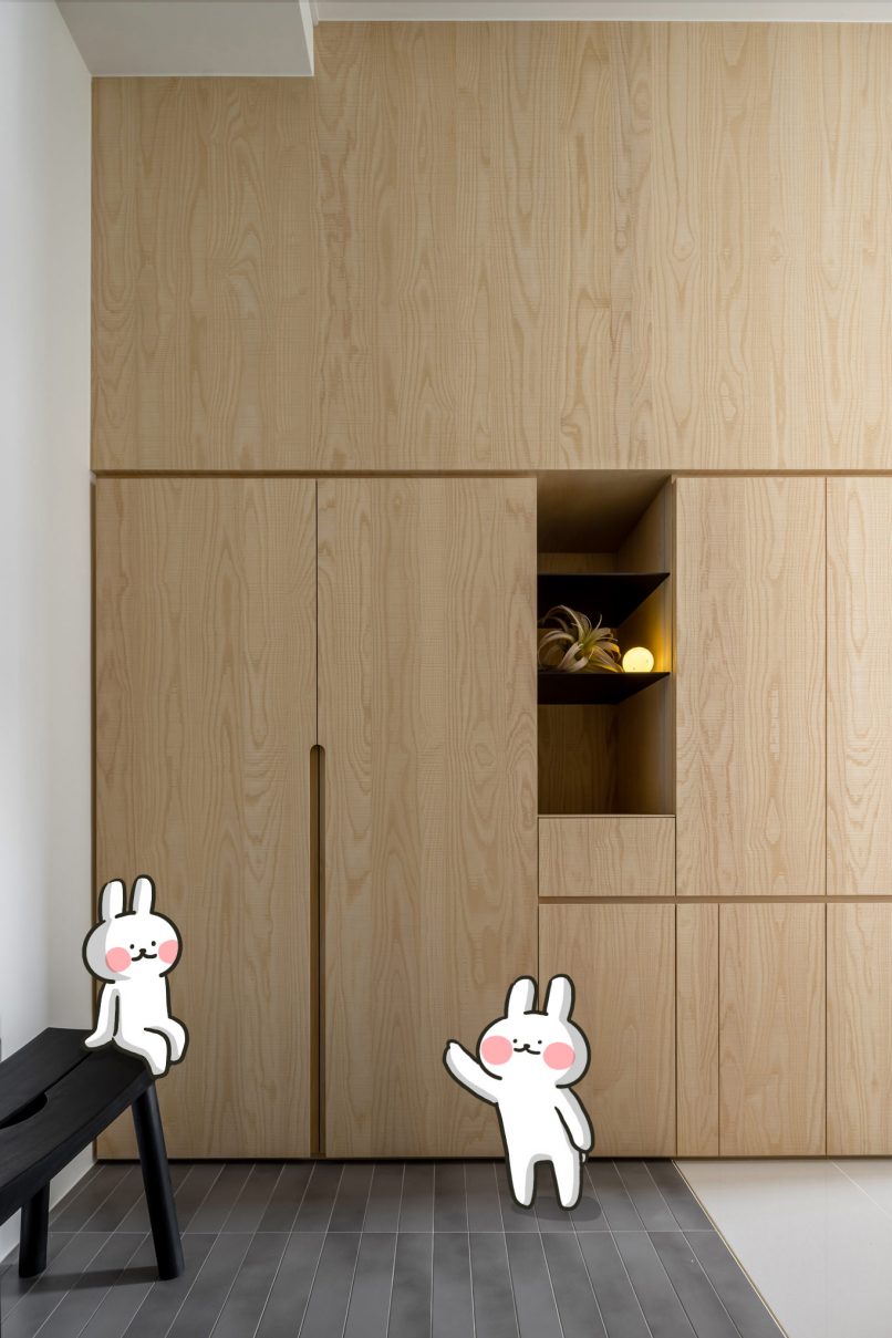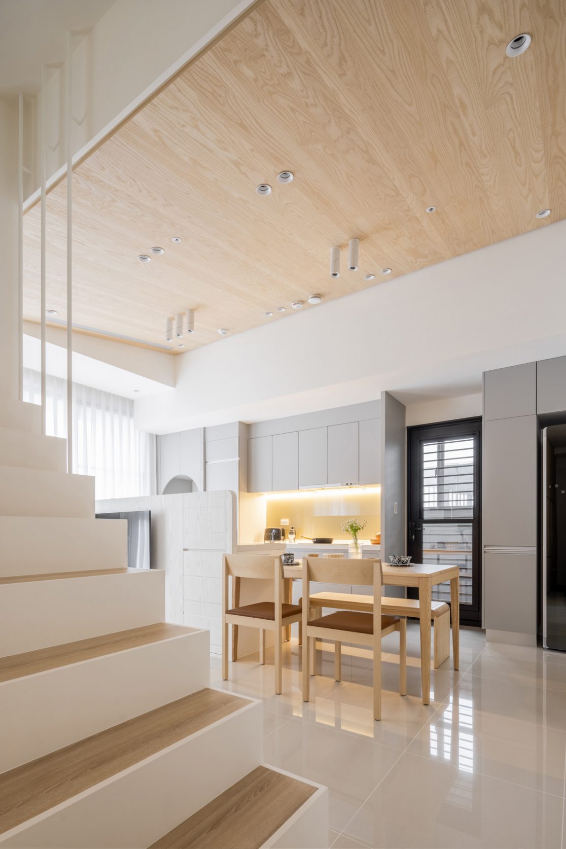 為結婚而準備、為退休而準備⋯,購屋對每個人來說都有著對未來的期待與準備。這個 15 坪小宅座落於理想學區,是屋主夫婦為了將來孩子們入學而準備。從預售屋階段就進行客變規劃,拆解建商原始制式 2 房 1 廳格局,重整為 3 房 2 廳配置。保留標配廚具及地磚,將省下的材料費用,轉至鋪設提升生活品質的地暖工程。打開封閉牆體,以開放式餐廚空間為生活重心,串連客廳,集中公區使用。挑高 3 米 6 以室內小建築「屋中屋」概念建構複層,精準的高度規劃與現場施作,提供屋主能直立行走使用的自在舒適,更創造豐富生活視角與互動對話。木斜頂天花設計,也為整體空間加乘放大視覺感受。 一樓多功能臥榻以雙開的衣帽櫃連通玄關,是在討論如何能縮短逃生動線時而衍生的想法,意外成為空間裡有趣的秘密通道、孩子們的另類遊戲路徑;二樓是夜間舒眠臥房也是日間謐靜天地,大面積的開闊視野以同時兼具使用與防護機能的護欄圍塑、側面小窗則可見生活脈動與孩子成長的輪廓。 小空間設計除了要能滿足使用機能,善用所有坪效,更重要的是為使用者創造不受空間壓縮的完整生活。Ready for the next step!從容自在、舒適餘裕。