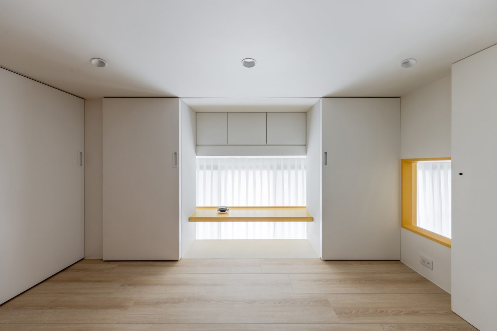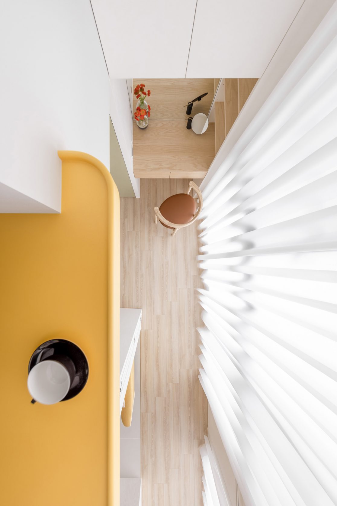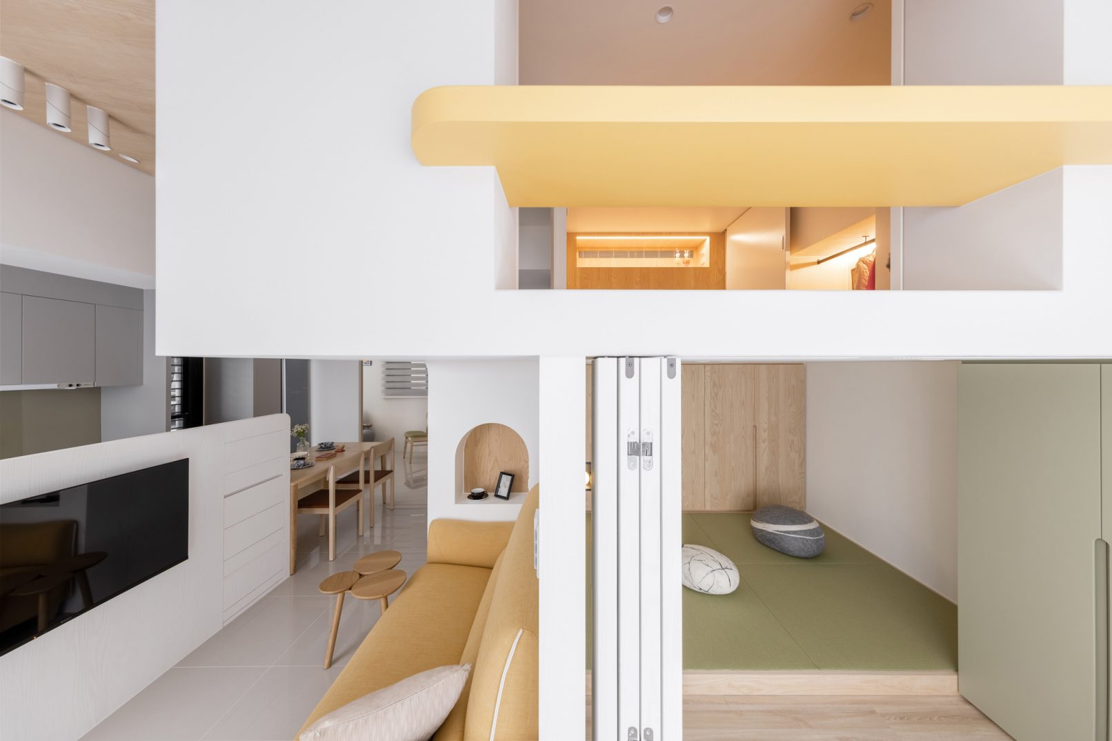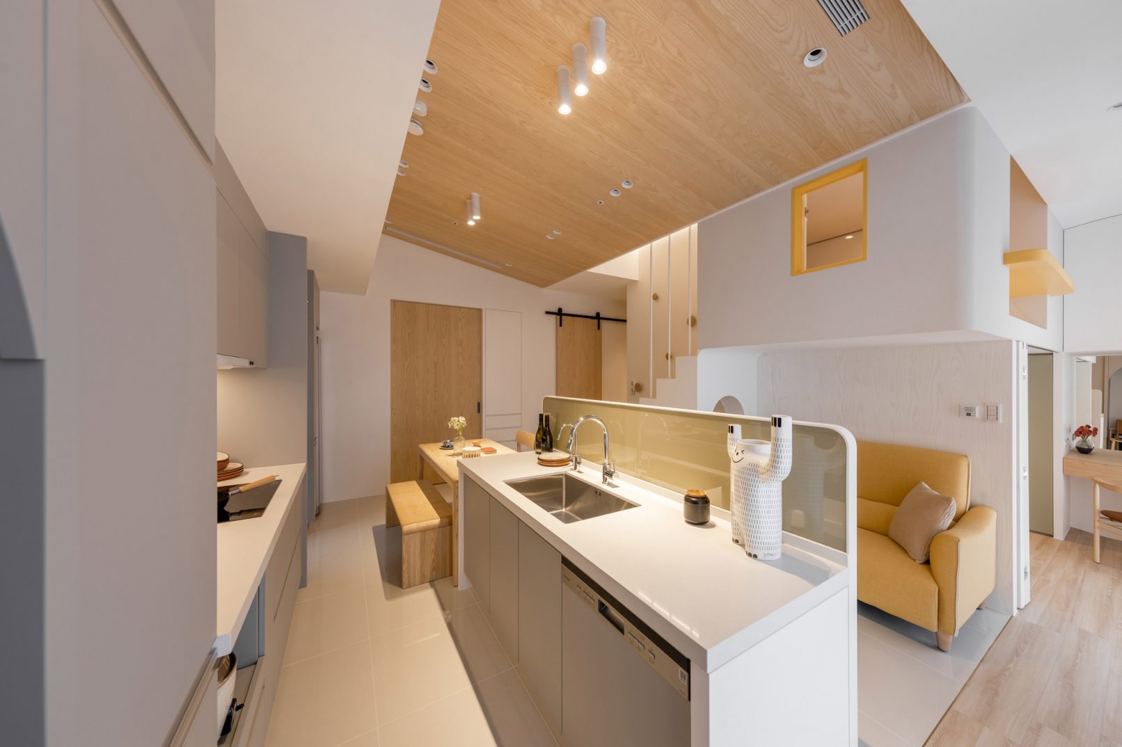 為結婚而準備、為退休而準備⋯,購屋對每個人來說都有著對未來的期待與準備。這個 15 坪小宅座落於理想學區,是屋主夫婦為了將來孩子們入學而準備。從預售屋階段就進行客變規劃,拆解建商原始制式 2 房 1 廳格局,重整為 3 房 2 廳配置。保留標配廚具及地磚,將省下的材料費用,轉至鋪設提升生活品質的地暖工程。打開封閉牆體,以開放式餐廚空間為生活重心,串連客廳,集中公區使用。挑高 3 米 6 以室內小建築「屋中屋」概念建構複層,精準的高度規劃與現場施作,提供屋主能直立行走使用的自在舒適,更創造豐富生活視角與互動對話。木斜頂天花設計,也為整體空間加乘放大視覺感受。 一樓多功能臥榻以雙開的衣帽櫃連通玄關,是在討論如何能縮短逃生動線時而衍生的想法,意外成為空間裡有趣的秘密通道、孩子們的另類遊戲路徑;二樓是夜間舒眠臥房也是日間謐靜天地,大面積的開闊視野以同時兼具使用與防護機能的護欄圍塑、側面小窗則可見生活脈動與孩子成長的輪廓。 小空間設計除了要能滿足使用機能,善用所有坪效,更重要的是為使用者創造不受空間壓縮的完整生活。Ready for the next step!從容自在、舒適餘裕。