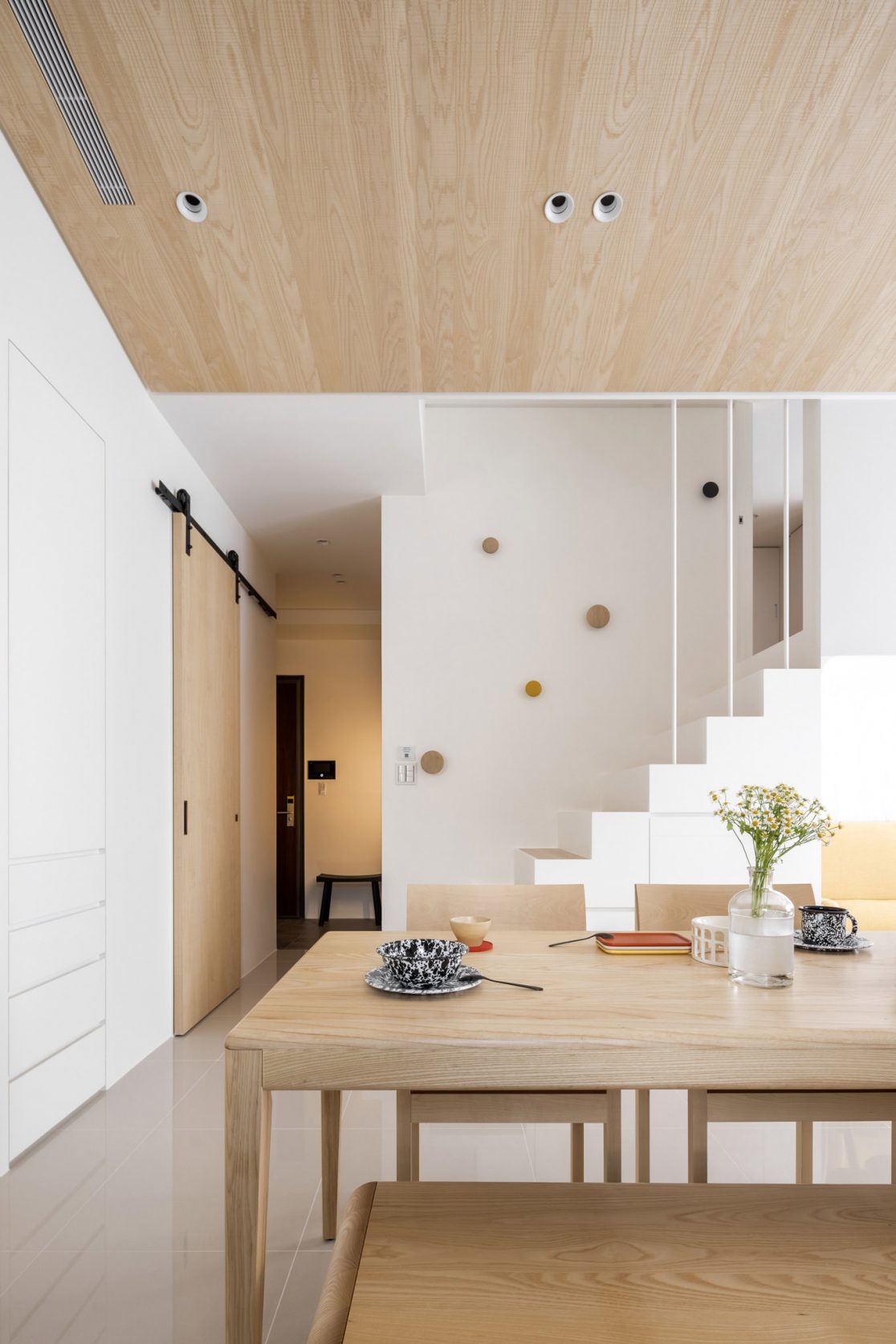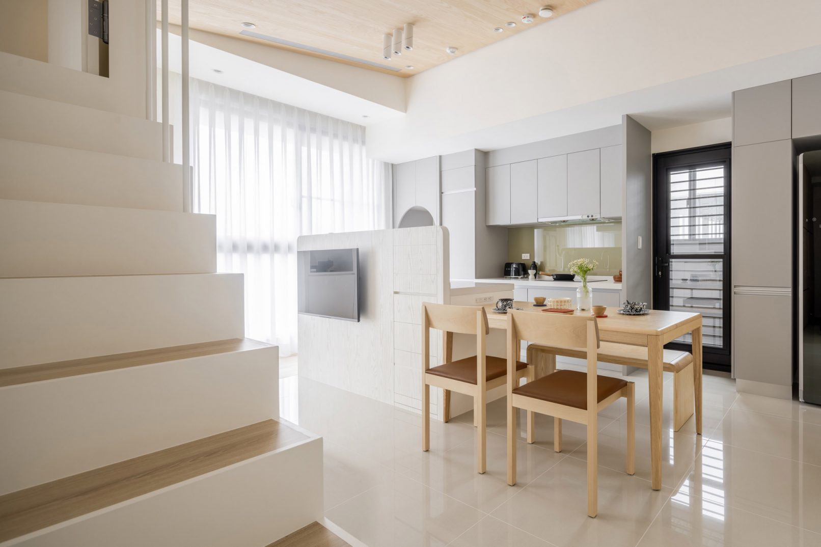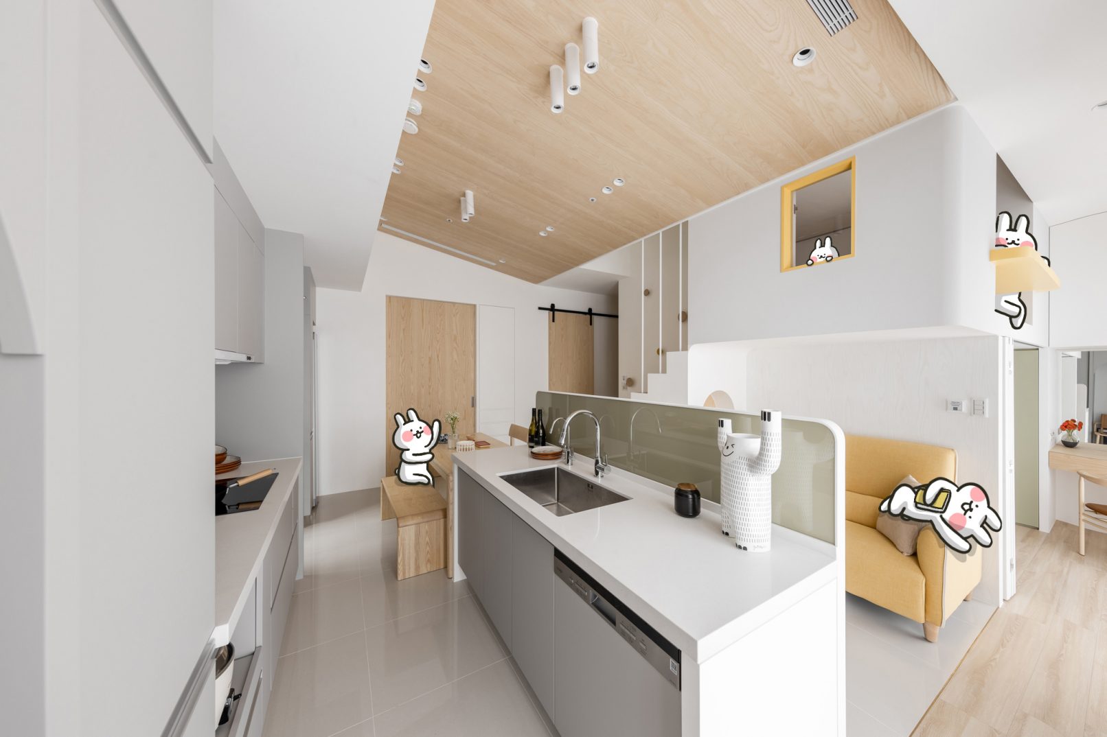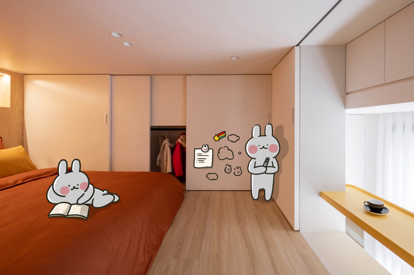 為結婚而準備、為退休而準備⋯,購屋對每個人來說都有著對未來的期待與準備。這個 15 坪小宅座落於理想學區,是屋主夫婦為了將來孩子們入學而準備。從預售屋階段就進行客變規劃,拆解建商原始制式 2 房 1 廳格局,重整為 3 房 2 廳配置。保留標配廚具及地磚,將省下的材料費用,轉至鋪設提升生活品質的地暖工程。打開封閉牆體,以開放式餐廚空間為生活重心,串連客廳,集中公區使用。挑高 3 米 6 以室內小建築「屋中屋」概念建構複層,精準的高度規劃與現場施作,提供屋主能直立行走使用的自在舒適,更創造豐富生活視角與互動對話。木斜頂天花設計,也為整體空間加乘放大視覺感受。 一樓多功能臥榻以雙開的衣帽櫃連通玄關,是在討論如何能縮短逃生動線時而衍生的想法,意外成為空間裡有趣的秘密通道、孩子們的另類遊戲路徑;二樓是夜間舒眠臥房也是日間謐靜天地,大面積的開闊視野以同時兼具使用與防護機能的護欄圍塑、側面小窗則可見生活脈動與孩子成長的輪廓。 小空間設計除了要能滿足使用機能,善用所有坪效,更重要的是為使用者創造不受空間壓縮的完整生活。Ready for the next step!從容自在、舒適餘裕。