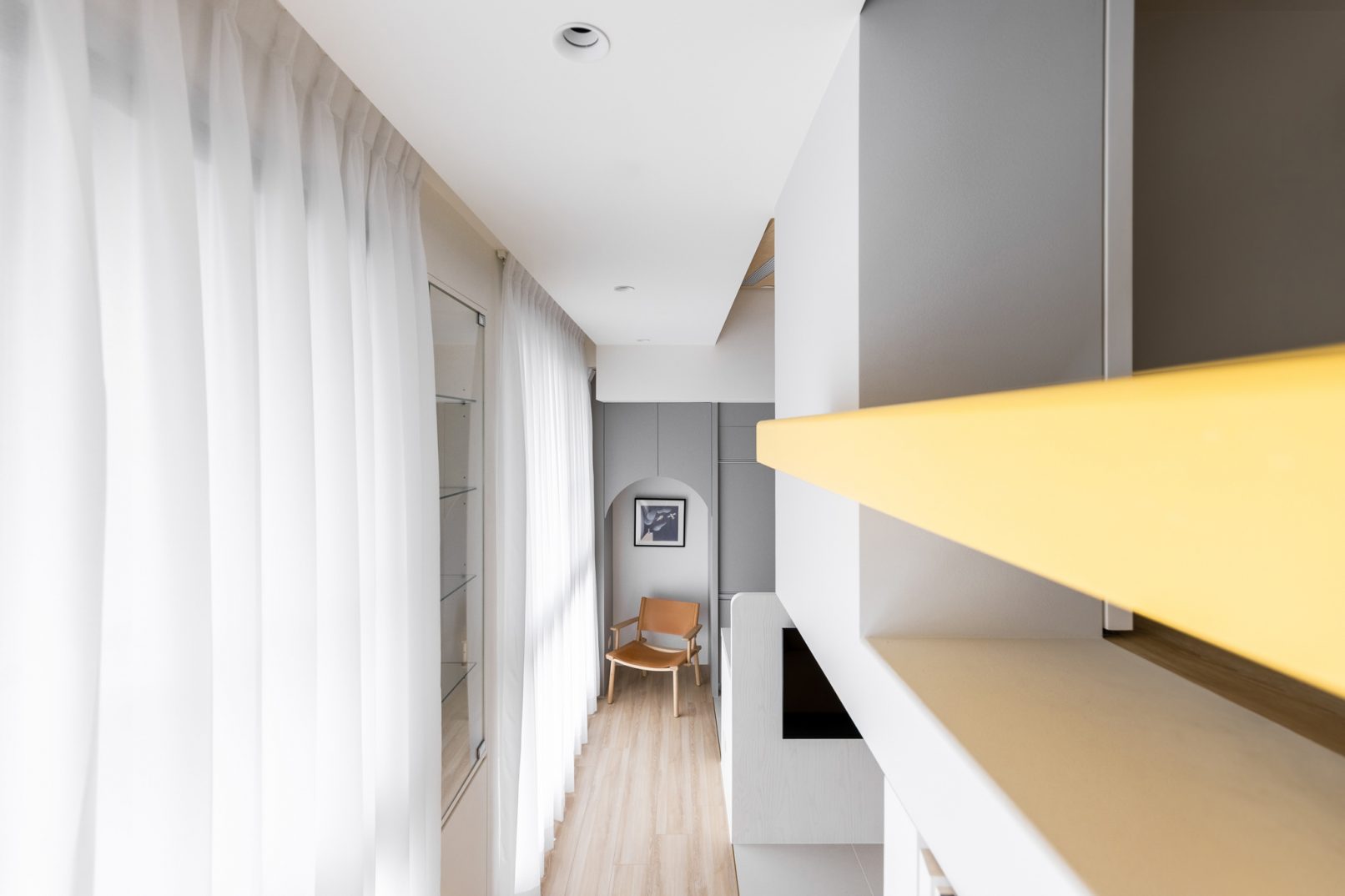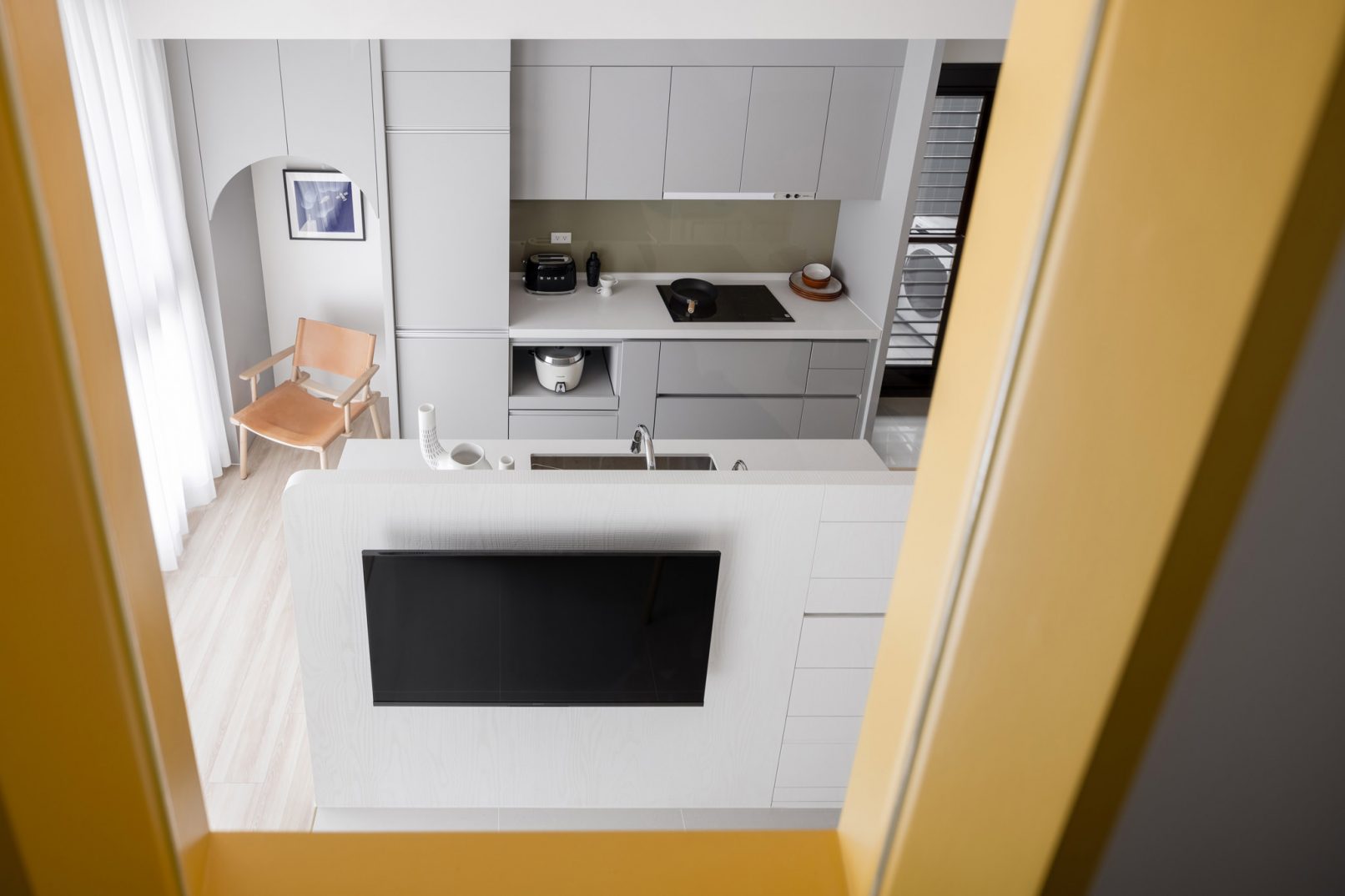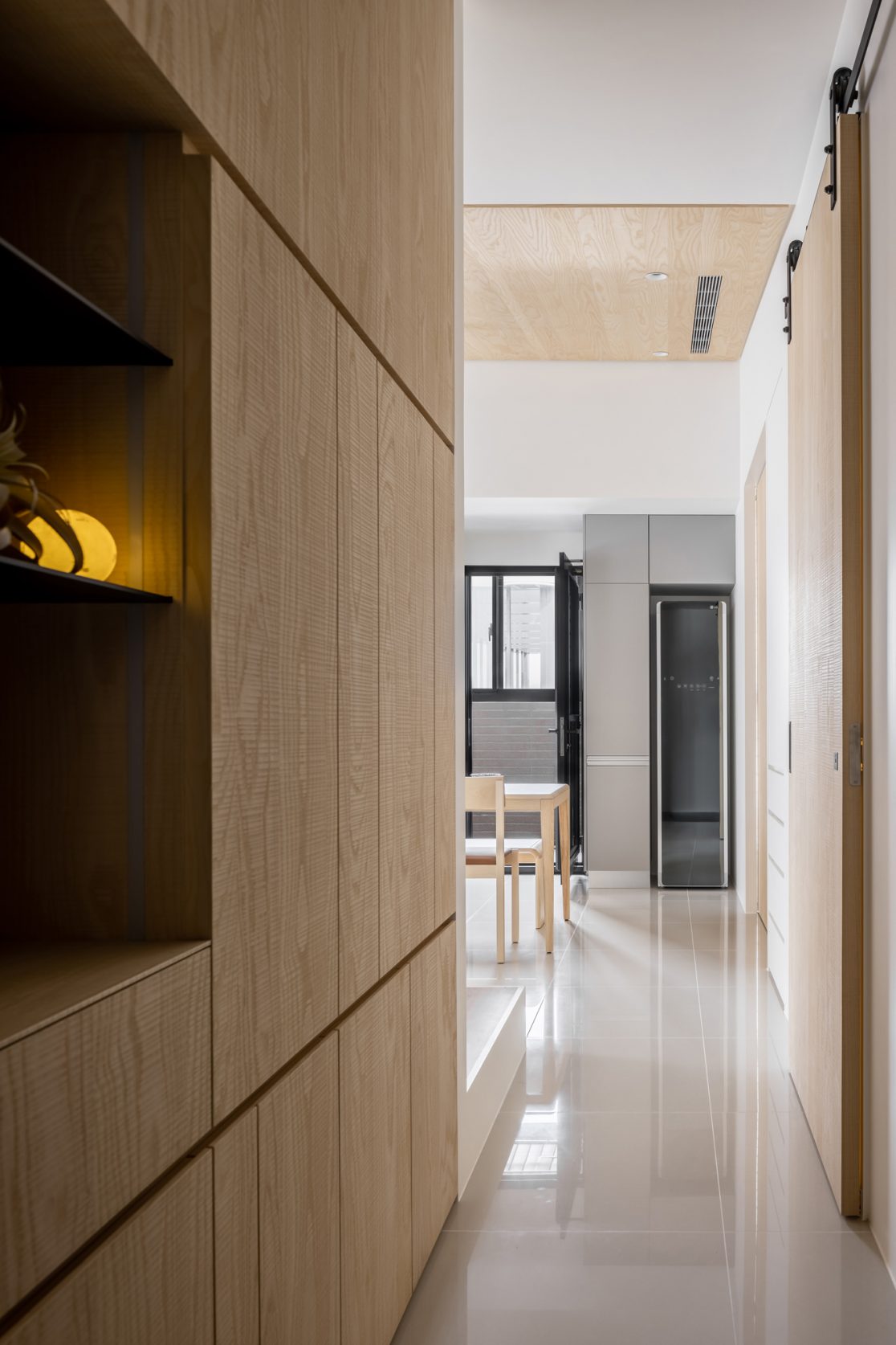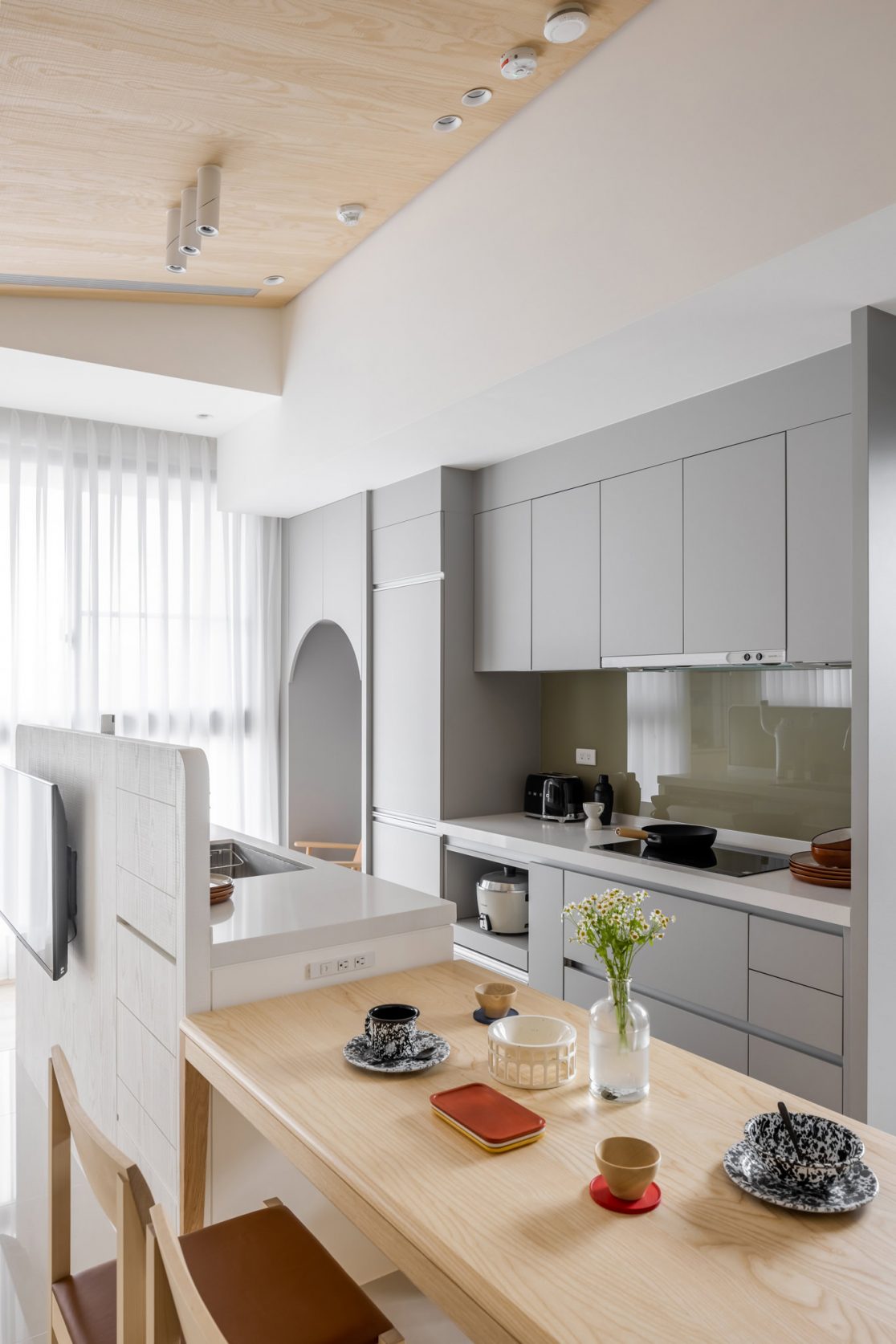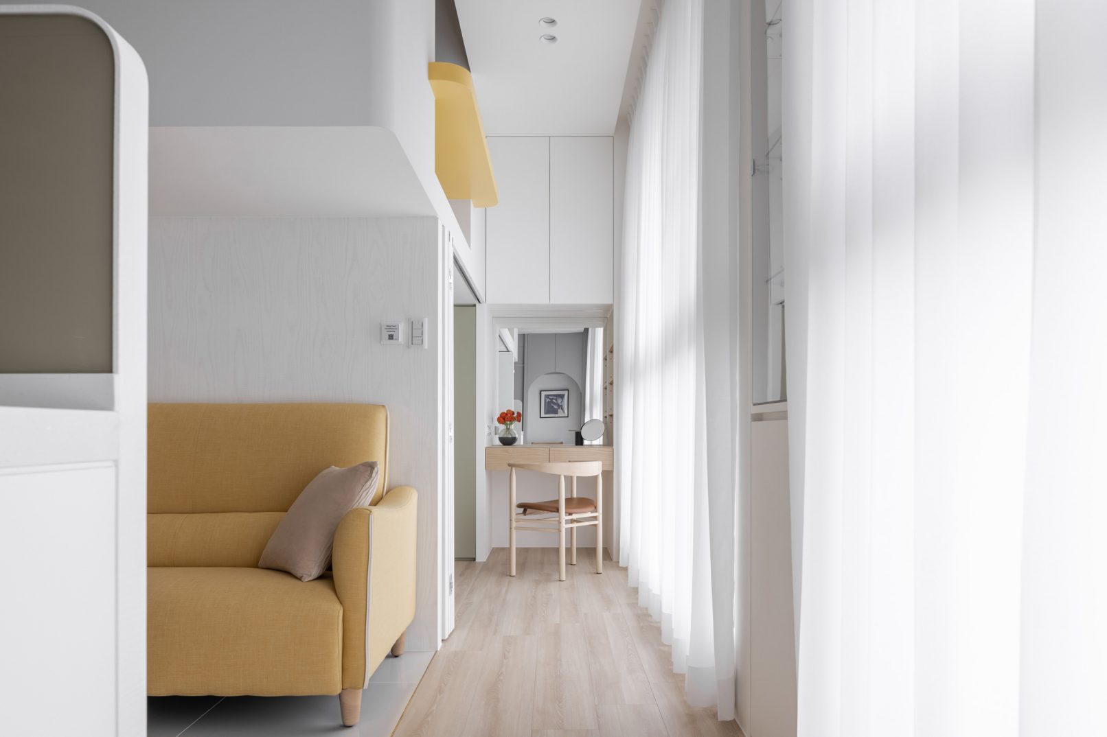 為結婚而準備、為退休而準備⋯,購屋對每個人來說都有著對未來的期待與準備。這個 15 坪小宅座落於理想學區,是屋主夫婦為了將來孩子們入學而準備。從預售屋階段就進行客變規劃,拆解建商原始制式 2 房 1 廳格局,重整為 3 房 2 廳配置。保留標配廚具及地磚,將省下的材料費用,轉至鋪設提升生活品質的地暖工程。打開封閉牆體,以開放式餐廚空間為生活重心,串連客廳,集中公區使用。挑高 3 米 6 以室內小建築「屋中屋」概念建構複層,精準的高度規劃與現場施作,提供屋主能直立行走使用的自在舒適,更創造豐富生活視角與互動對話。木斜頂天花設計,也為整體空間加乘放大視覺感受。 一樓多功能臥榻以雙開的衣帽櫃連通玄關,是在討論如何能縮短逃生動線時而衍生的想法,意外成為空間裡有趣的秘密通道、孩子們的另類遊戲路徑;二樓是夜間舒眠臥房也是日間謐靜天地,大面積的開闊視野以同時兼具使用與防護機能的護欄圍塑、側面小窗則可見生活脈動與孩子成長的輪廓。 小空間設計除了要能滿足使用機能,善用所有坪效,更重要的是為使用者創造不受空間壓縮的完整生活。Ready for the next step!從容自在、舒適餘裕。