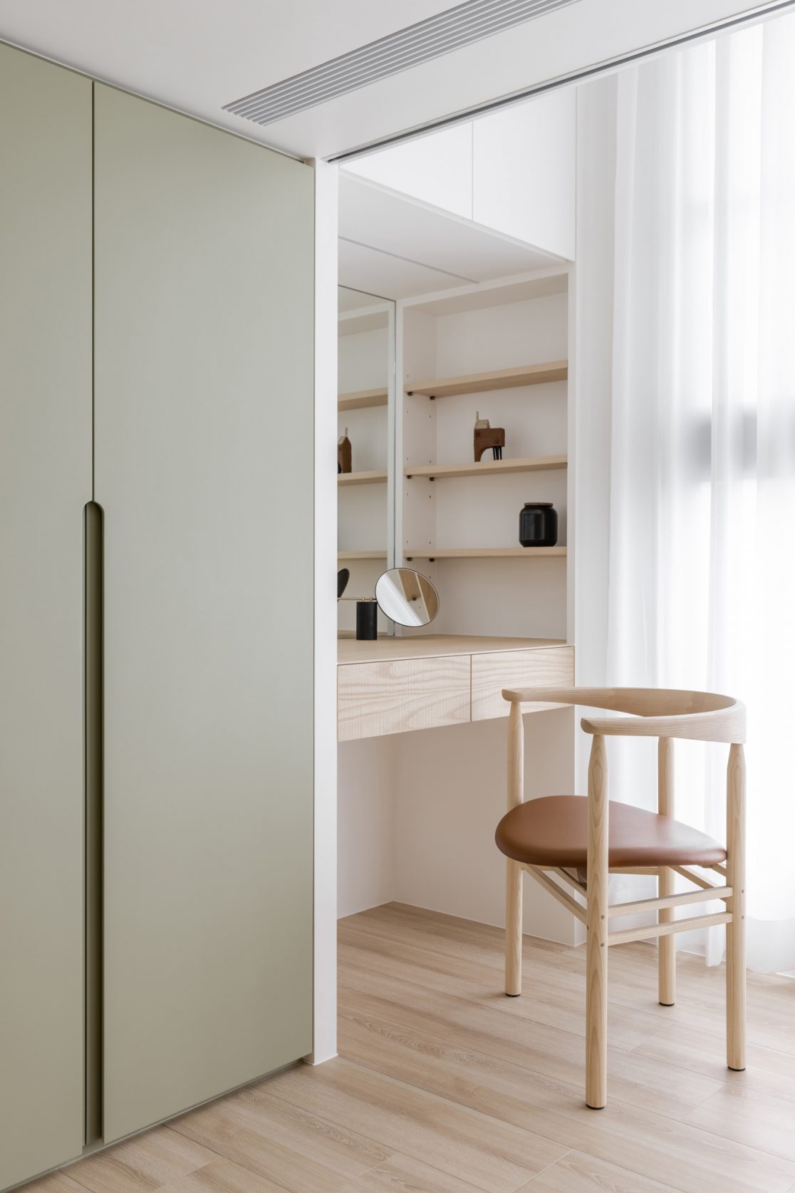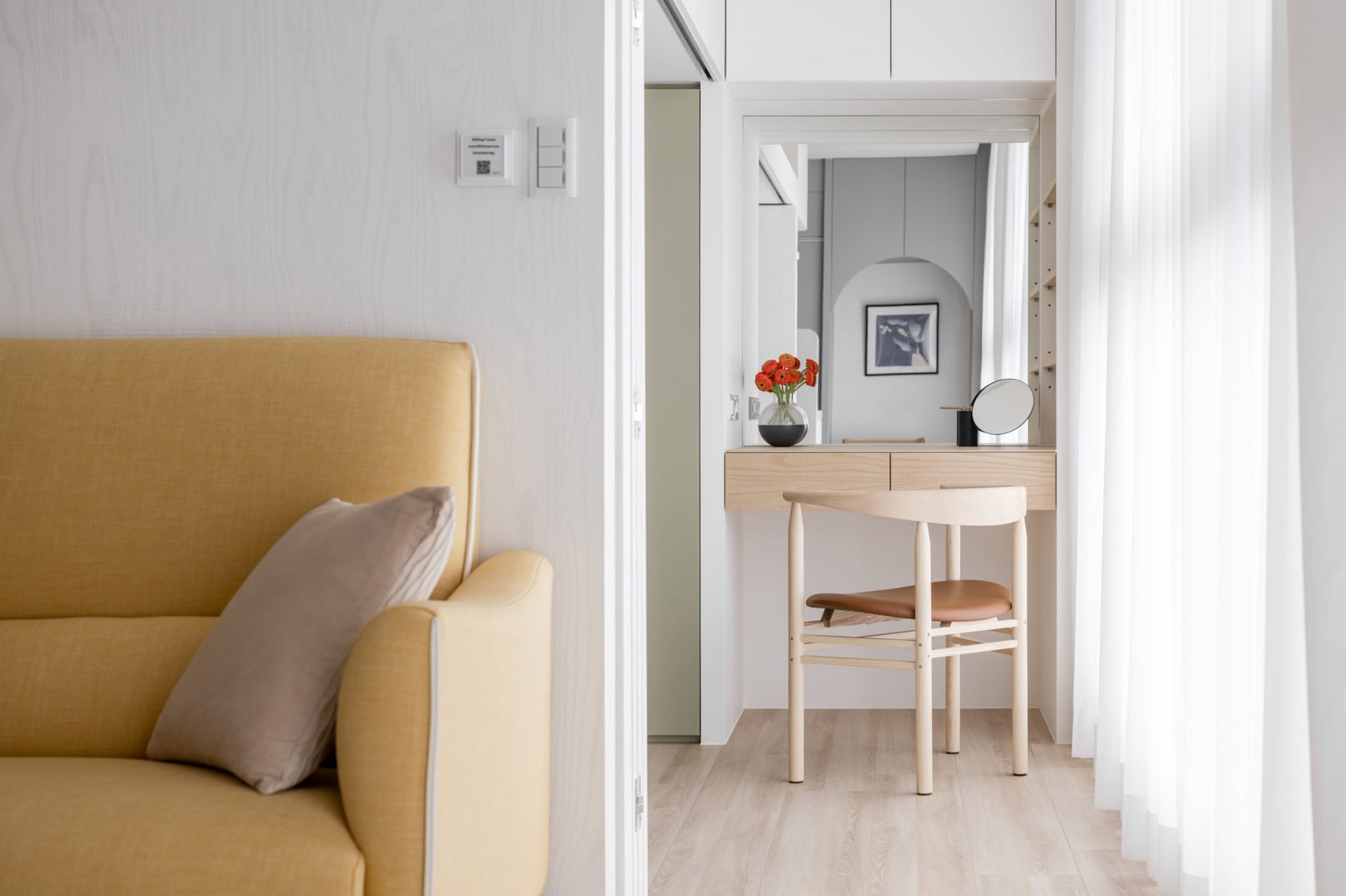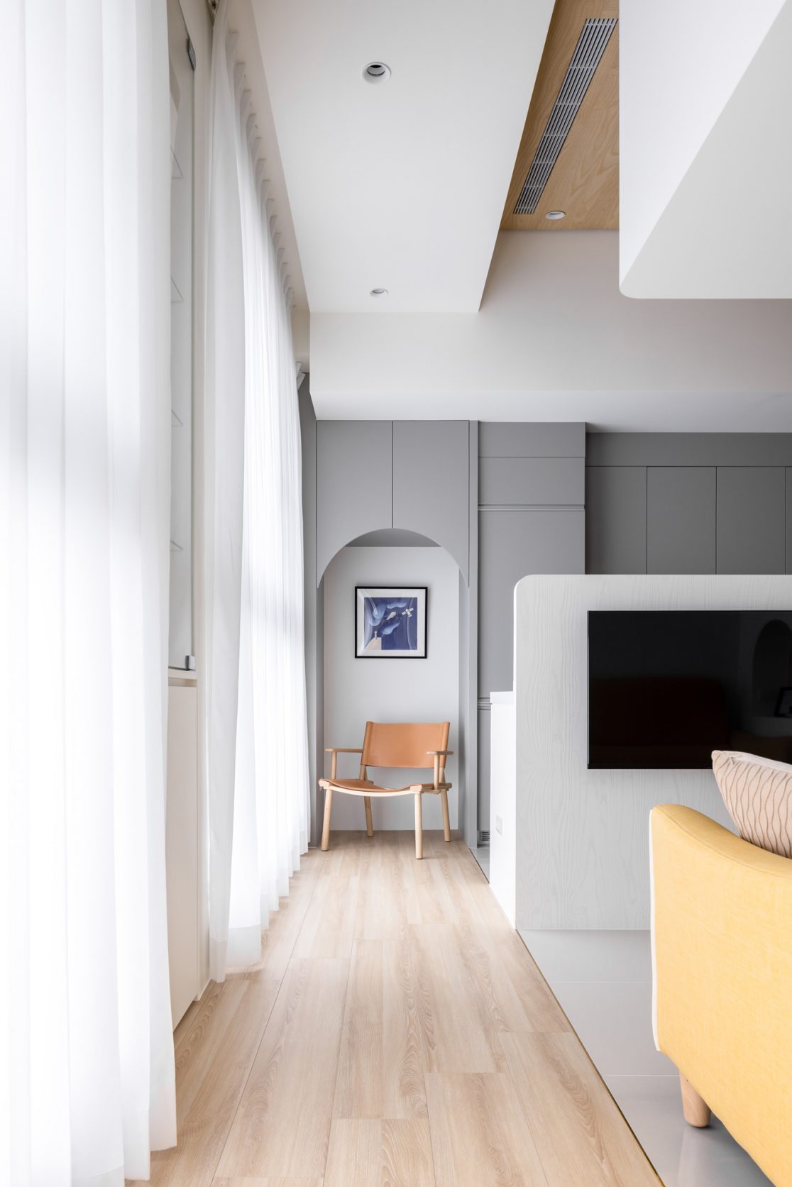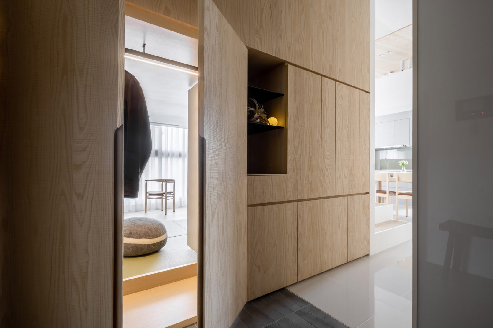 為結婚而準備、為退休而準備⋯,購屋對每個人來說都有著對未來的期待與準備。這個 15 坪小宅座落於理想學區,是屋主夫婦為了將來孩子們入學而準備。從預售屋階段就進行客變規劃,拆解建商原始制式 2 房 1 廳格局,重整為 3 房 2 廳配置。保留標配廚具及地磚,將省下的材料費用,轉至鋪設提升生活品質的地暖工程。打開封閉牆體,以開放式餐廚空間為生活重心,串連客廳,集中公區使用。挑高 3 米 6 以室內小建築「屋中屋」概念建構複層,精準的高度規劃與現場施作,提供屋主能直立行走使用的自在舒適,更創造豐富生活視角與互動對話。木斜頂天花設計,也為整體空間加乘放大視覺感受。 一樓多功能臥榻以雙開的衣帽櫃連通玄關,是在討論如何能縮短逃生動線時而衍生的想法,意外成為空間裡有趣的秘密通道、孩子們的另類遊戲路徑;二樓是夜間舒眠臥房也是日間謐靜天地,大面積的開闊視野以同時兼具使用與防護機能的護欄圍塑、側面小窗則可見生活脈動與孩子成長的輪廓。 小空間設計除了要能滿足使用機能,善用所有坪效,更重要的是為使用者創造不受空間壓縮的完整生活。Ready for the next step!從容自在、舒適餘裕。
