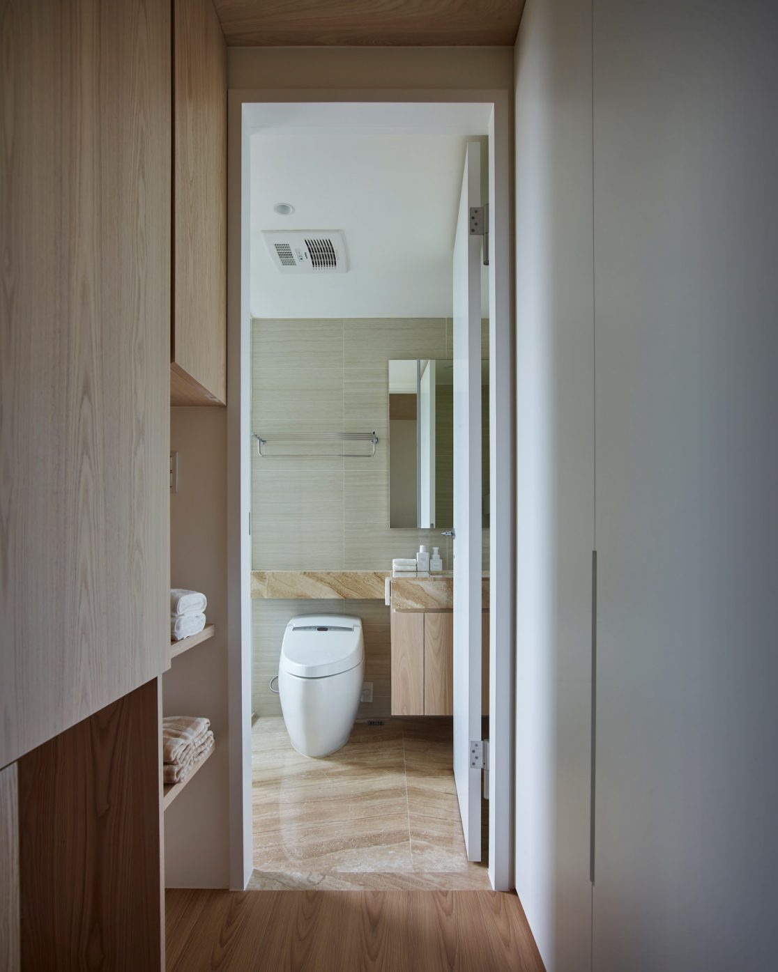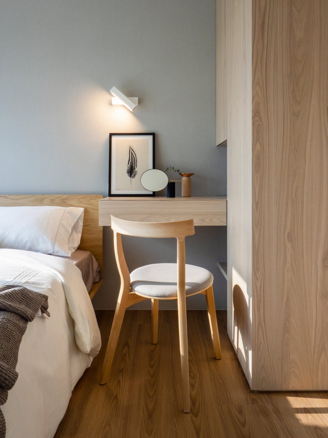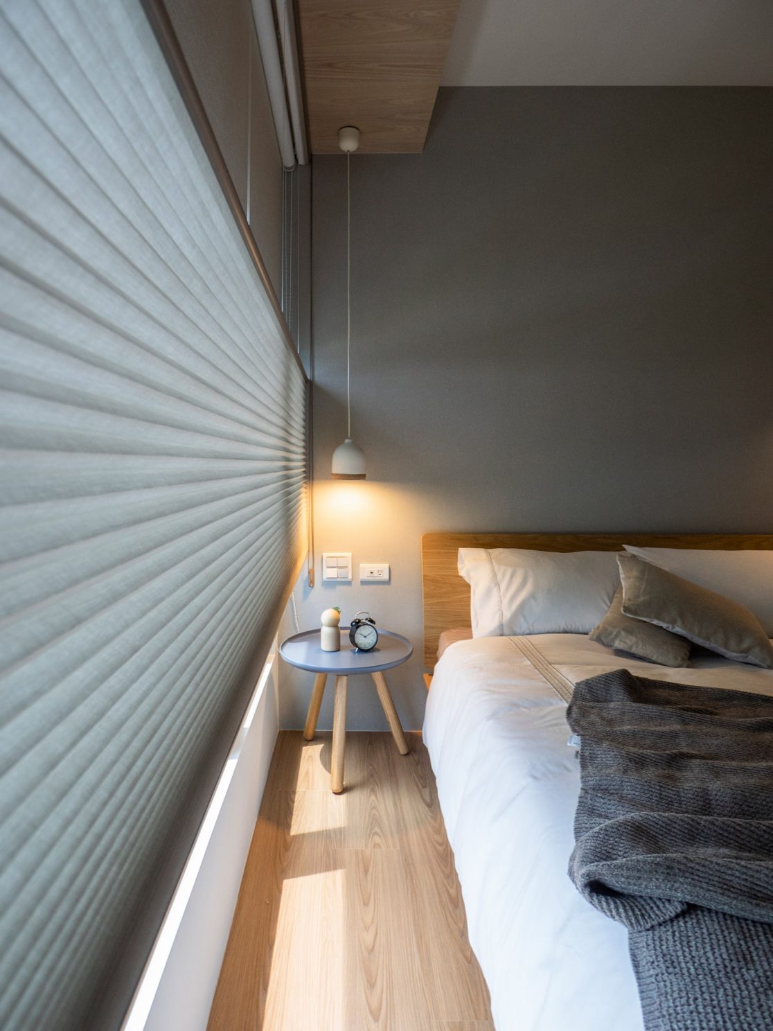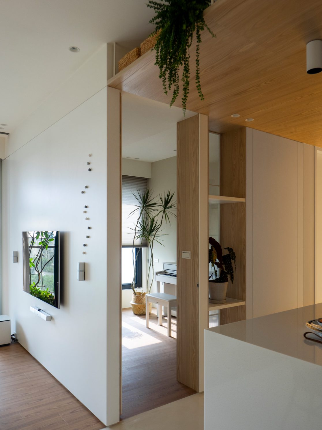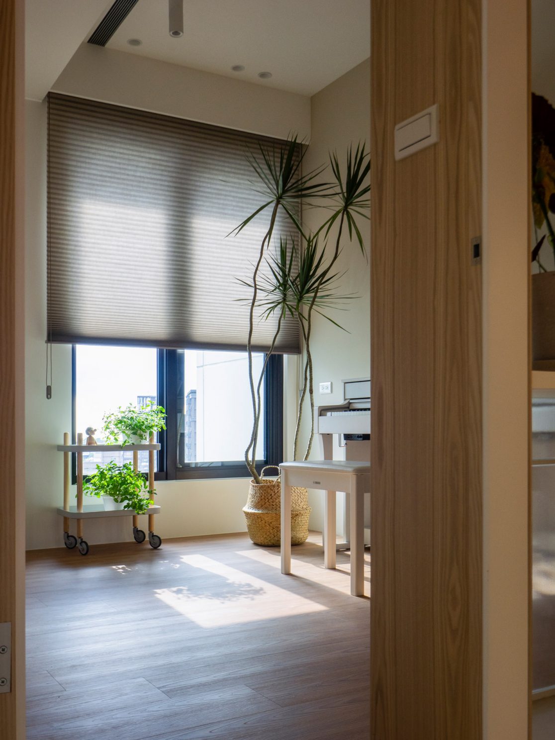 自然的光影為日常添上輕盈與節奏,而適切的溫暖質地與生活感受,則是我們為熱愛無印風的屋主,所拿捏的設計主軸。重新分配後的空間規劃,如半開放式的廚房,拉上兩邊玻璃拉門,便能輕易煮食區的油煙區隔;透過簡潔的中島,即可同時串連起客廳、餐廳、琴房;戶外的陽光、微風以及陽台上綠意也都與室內有著自然地對話與互動。整體使用淺色調搭配溫暖木材質,無太多裝飾性設計,打造自然且柔和的生活。