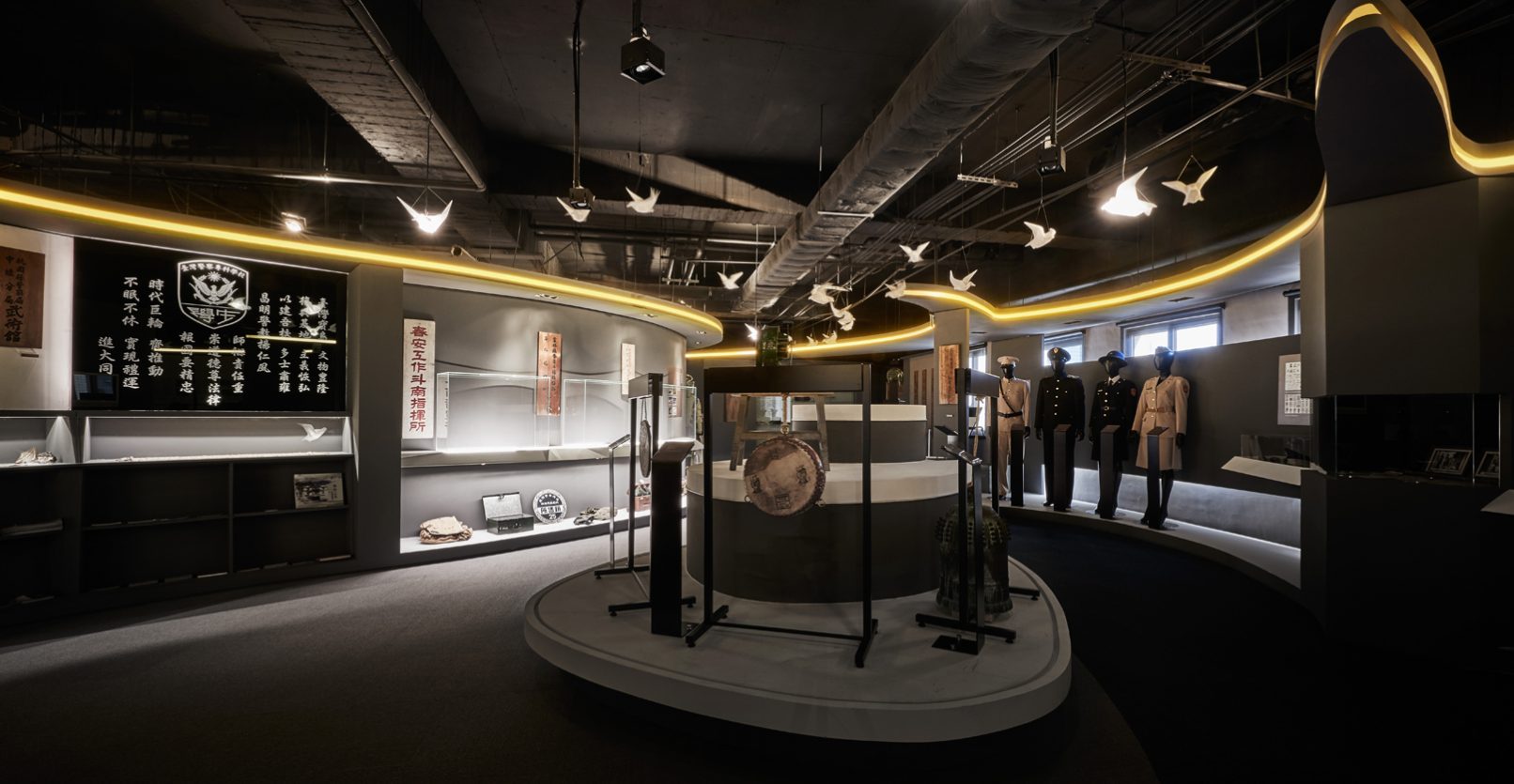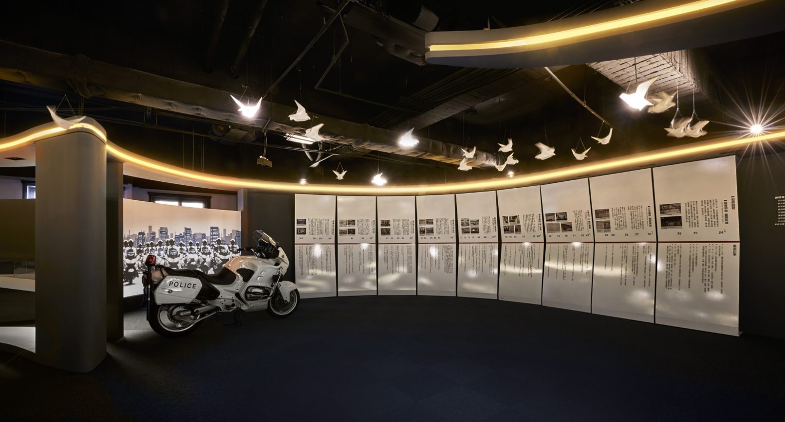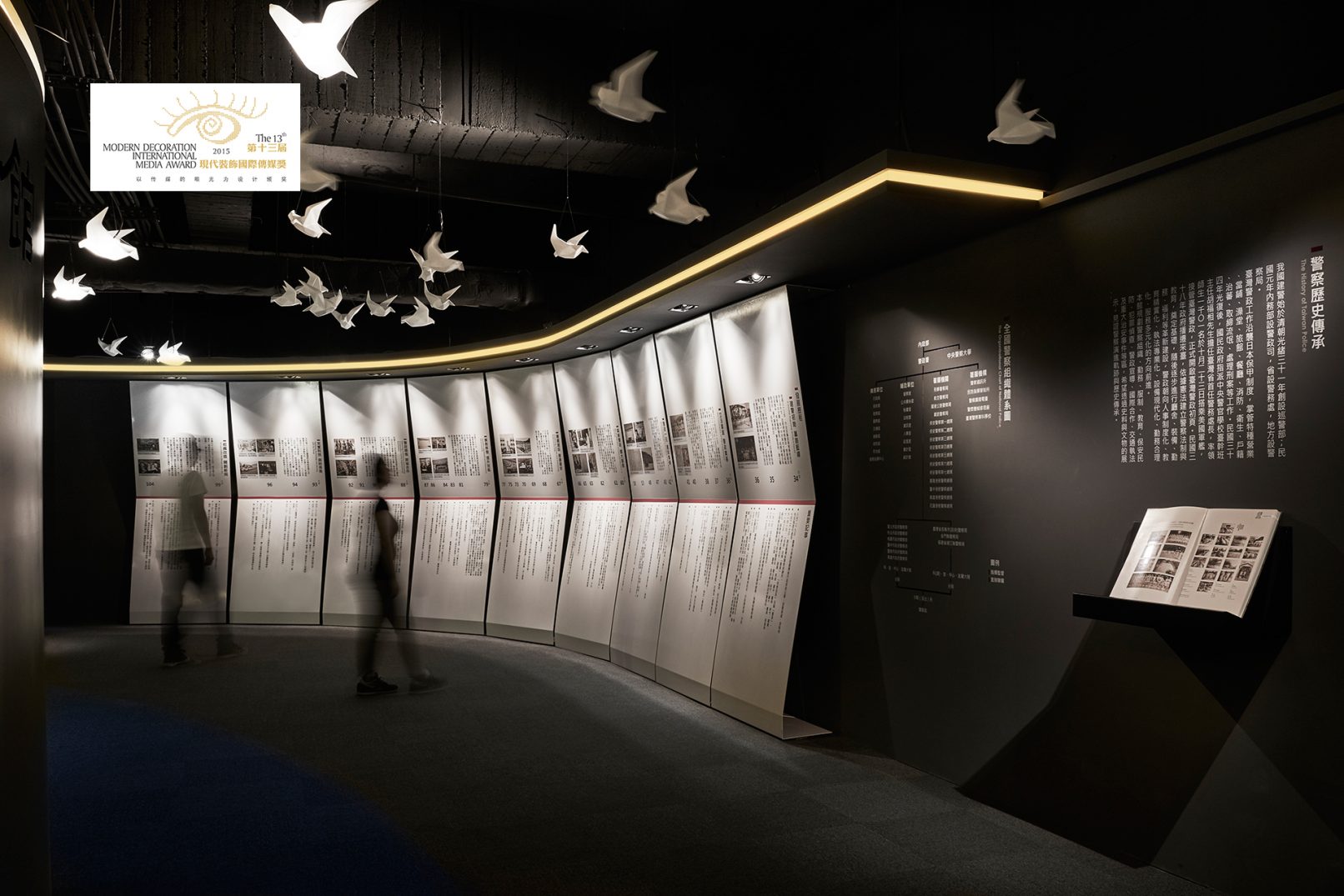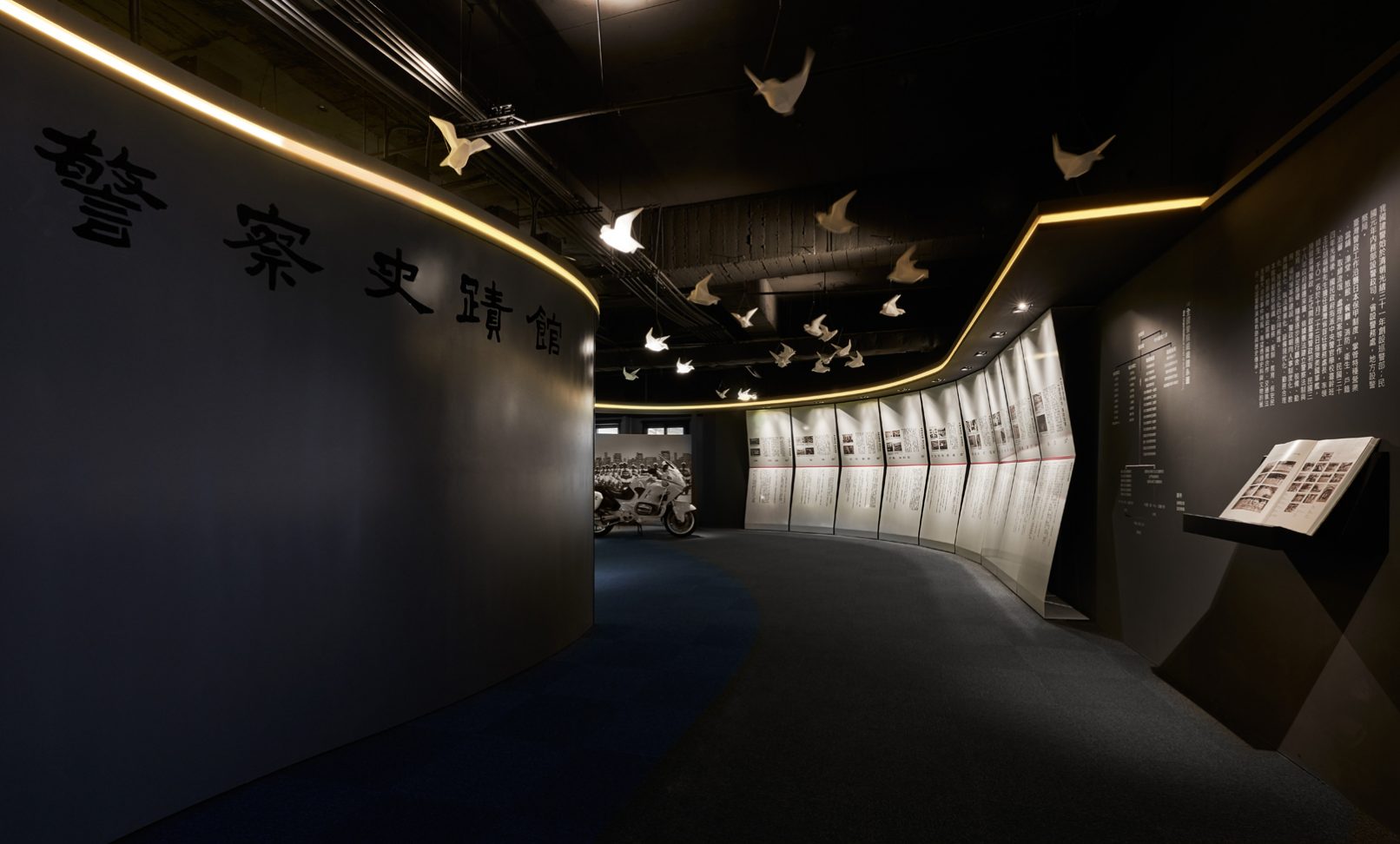 作為台灣首座具規模的警察史蹟館,這個難得的空間保存了自清朝建立警察制度、日據時期至今,百餘年來關於台灣警政歷史的變革 。 我們從沒注意到,警察是時時刻刻無處不在,默默地隱身在社會上不同的角落守護著我們。因此史蹟館空間的主要設計概念,以一隻碩大的金吾鳥(警鴿)翱翔於空中由上俯視為其輪廓,象徵著民眾們總是在不知不覺間受到保護;以3D列印技術打造、懸掛在空間中的「警鴿吊燈」,有的發亮、有的被照亮,就如那些在明或在暗裡保護我們的無名英雄; 帶著光源的警鴿與櫃體上方象徵警帽帽簷般的黃色燈條,指引出安全的參觀動線;配合地毯上深淺灰色及藍色,分別代表內外兩圈環狀動線外,也象徵了警徽圖騰。在這裡,看不見的是無時無刻的保護,看得見的是值得你細細了解的警察歷史。