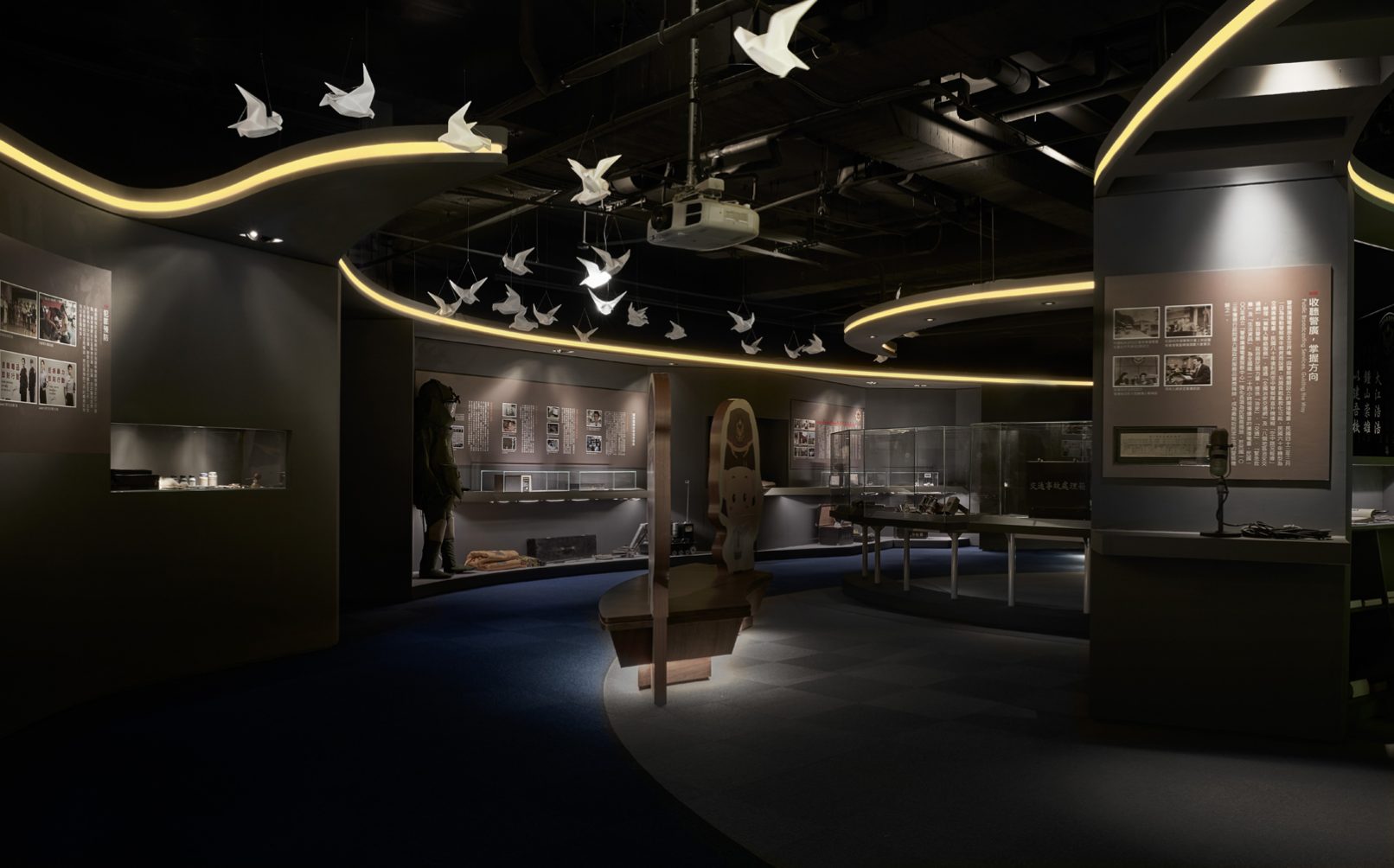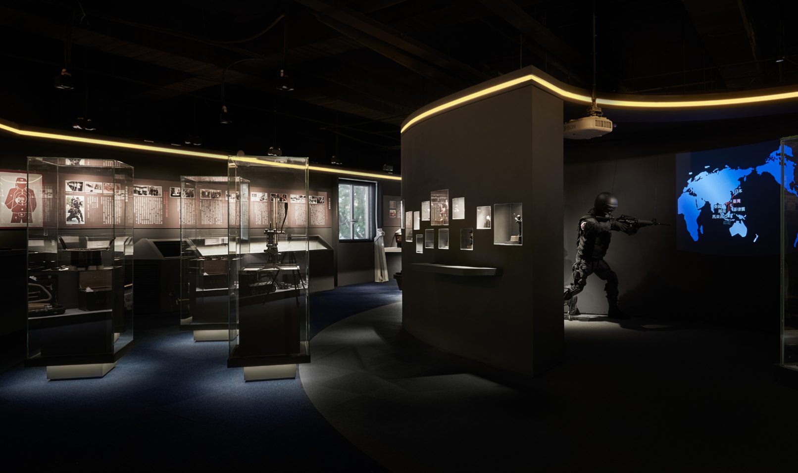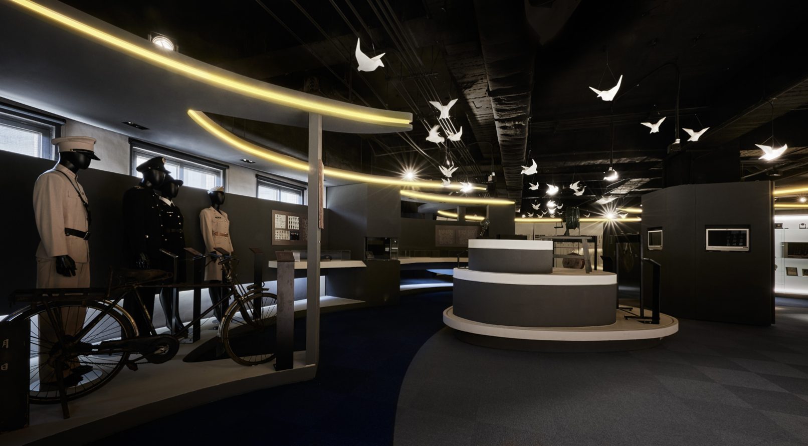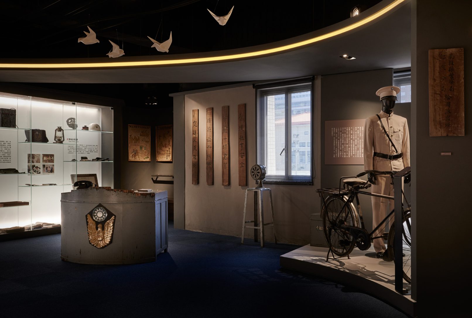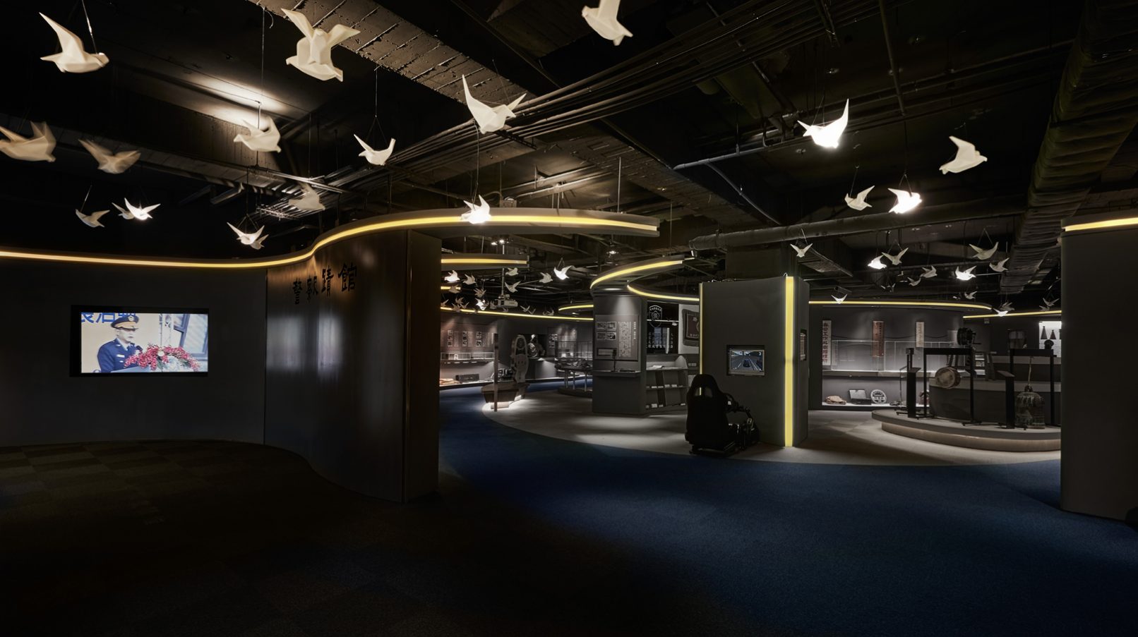 作為台灣首座具規模的警察史蹟館,這個難得的空間保存了自清朝建立警察制度、日據時期至今,百餘年來關於台灣警政歷史的變革 。 我們從沒注意到,警察是時時刻刻無處不在,默默地隱身在社會上不同的角落守護著我們。因此史蹟館空間的主要設計概念,以一隻碩大的金吾鳥(警鴿)翱翔於空中由上俯視為其輪廓,象徵著民眾們總是在不知不覺間受到保護;以3D列印技術打造、懸掛在空間中的「警鴿吊燈」,有的發亮、有的被照亮,就如那些在明或在暗裡保護我們的無名英雄; 帶著光源的警鴿與櫃體上方象徵警帽帽簷般的黃色燈條,指引出安全的參觀動線;配合地毯上深淺灰色及藍色,分別代表內外兩圈環狀動線外,也象徵了警徽圖騰。在這裡,看不見的是無時無刻的保護,看得見的是值得你細細了解的警察歷史。