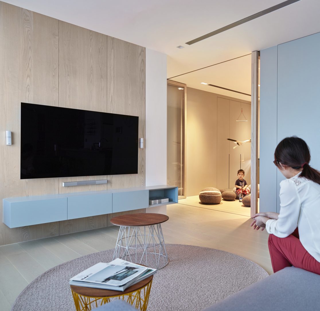 For this family with a young child,the very concept of home goes beyond a space to provide relaxation for the families. It is meant to be a foundation upon which life feels much at ease, and interaction with one another becomes effortless. We redesign the kitchen and make it opened up to the rest of the house. So now cooking goes from a lab experiment behind closed doors to now a much more interactive experience between the family members. See-through glass door is now outfitted to the play room to make it easier for parents to keep an eye on their kids when adults relax on the couch. A life together with higher level of interaction proves to be crucial to feeling secured. Our redesign shortened the once-narrow hallway and make it much brighter visually. An oblique ceiling structure gives off a wider feel on top of the dining table. Many design features of this house centered around an open and easy vibe, which really paves the way to a breezy and comfortable family life.