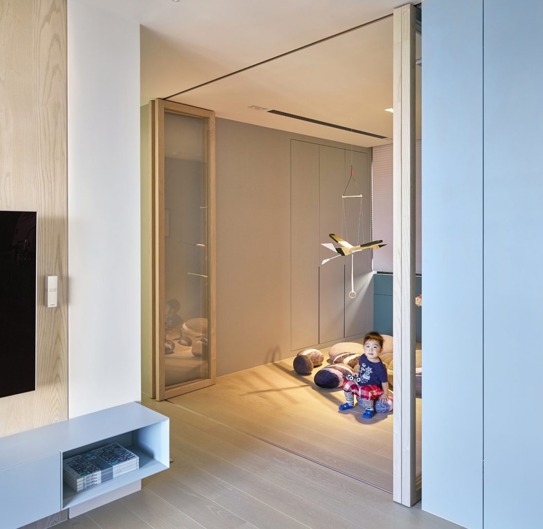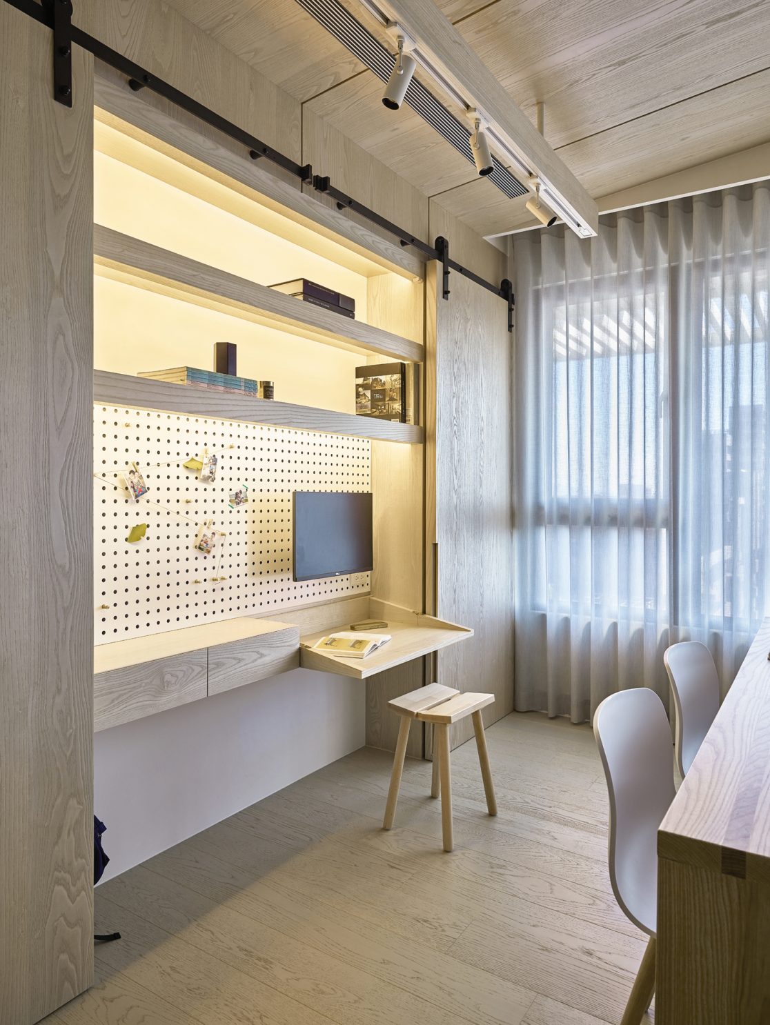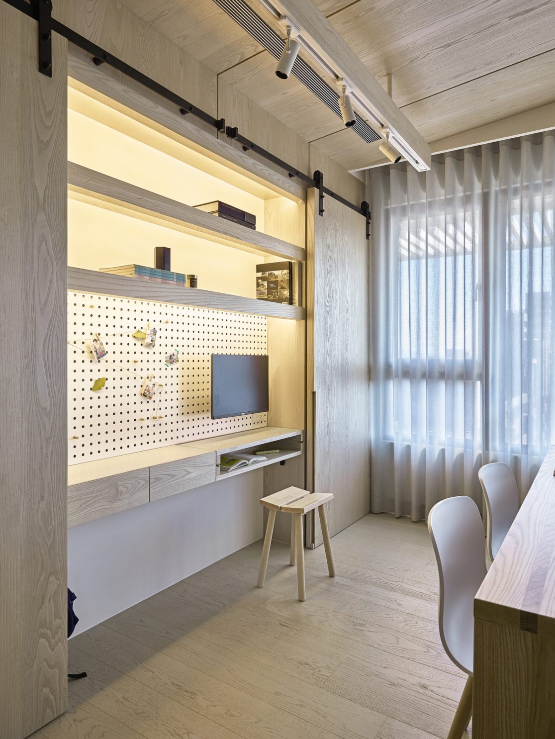 對有小孩的父母,一個家不只是放鬆的地方,更是與小孩互動互見、時刻保持安心的空間。在這個三人小家庭的房子,封閉的廚房改成開放設計,讓媽媽料理時能輕易與家人互動;為小孩打造換上通透玻璃門的遊戲室,讓大人在沙發上休息時也能看到小孩,隨時加入展開一場親子遊戲。層層互動與各種生活的交叉串連,也為父母增添育兒所需的互動與安心。而原本狹長的走道在經過格局調整後縮短變得明亮,餐桌區上方的斜頂設計也放大出空間視覺感,整體的開放通透,讓這個家注滿輕盈放鬆的愉悅。