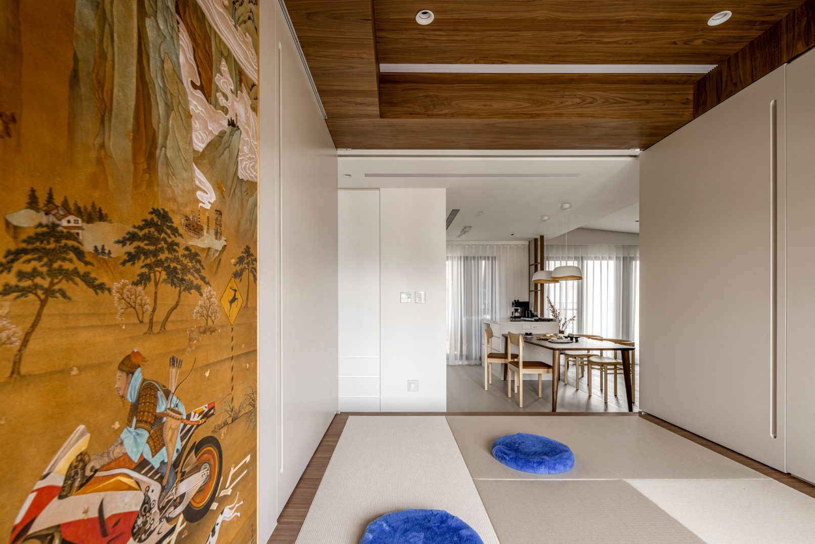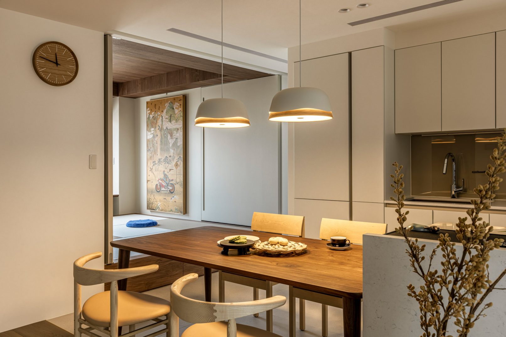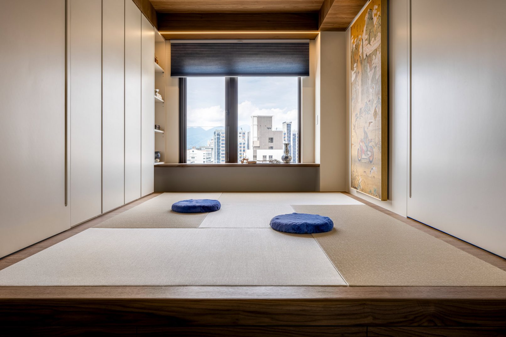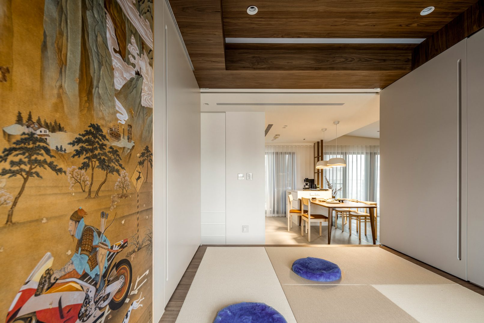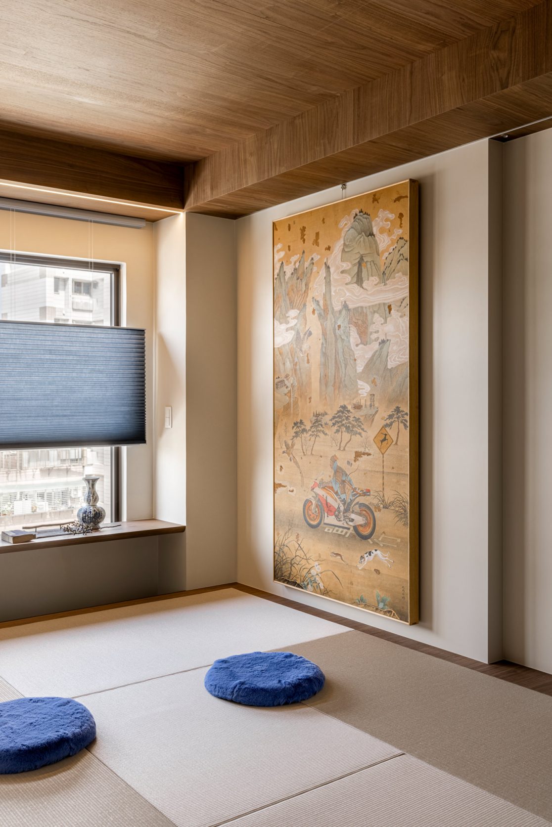 預售屋時即進行客變設計,以屋主喜愛的日本文化出發規劃,重整格局。結合高樓層視野優勢,釋出原始一封閉臥室,調整為可彈性開闔的多功能景觀和室,多元使用,也讓更多採光有機會進到公共空間。廁浴則在原位進行微調,讓廁浴分離的同時,引光進廁間,並在浴室放進本來不足空間擺放的獨立浴缸。如同屋主在飲食上重視對食材的純粹,空間的材質配置,也從單純、能感受本質的基調進行,包含寬板且具倒角細節的實木地板、適合有水環境但仍有紋理的木紋磚,擁有自然觸感的天然礦物塗料、和紙席面榻榻米等。位於空間中央的大樑,透過仿若日式屋頂般的斜頂設計修飾,並藉此拉大空間感。軟裝方案則在沈穩的深色胡桃木色調中,以不同形式的典雅藍色,點綴表現屋主開朗性格。家的風景,彷彿人生縮影。品味走過的激情與悠然,越靜越緩、越輕越暖。