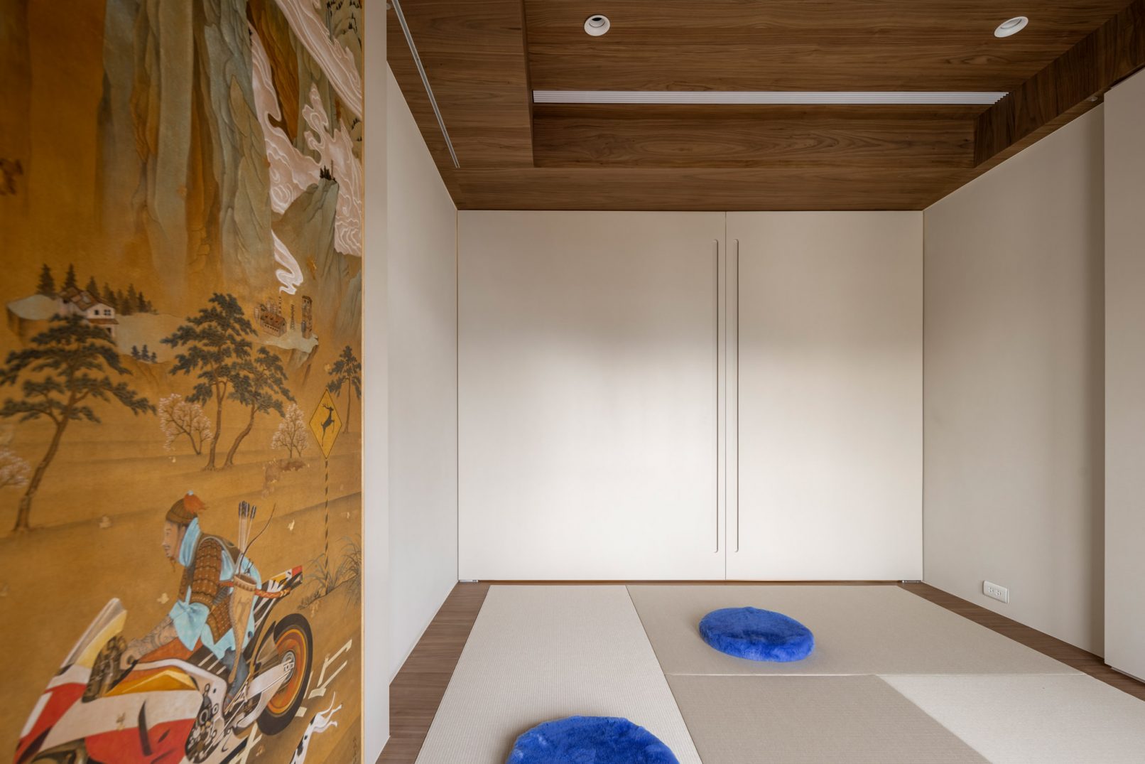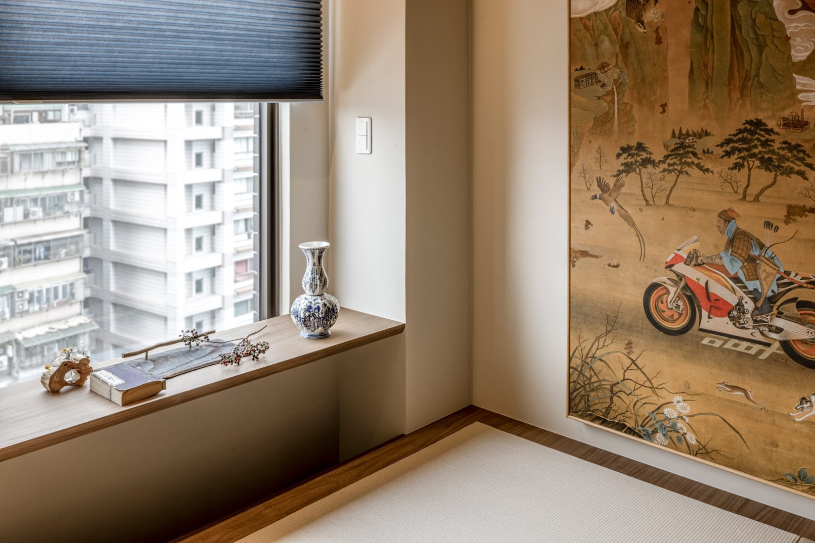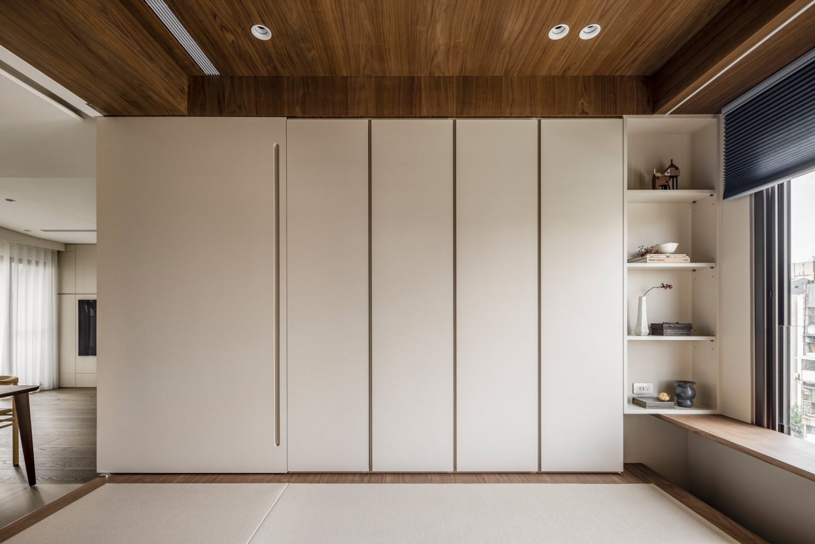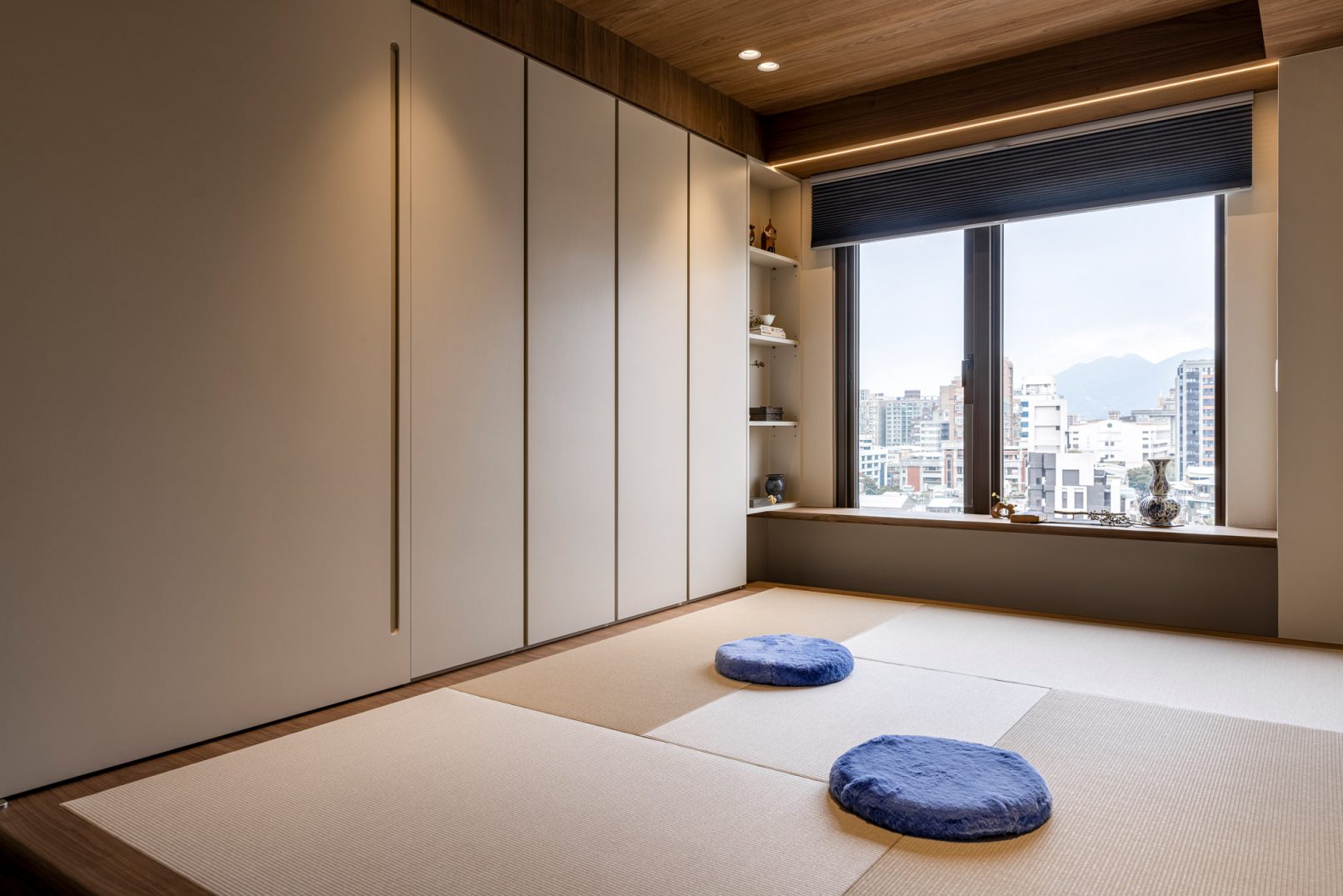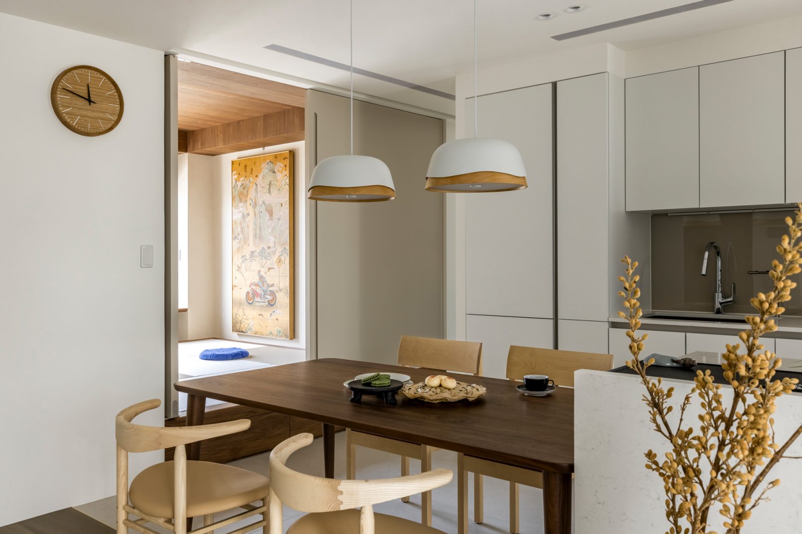 預售屋時即進行客變設計,以屋主喜愛的日本文化出發規劃,重整格局。結合高樓層視野優勢,釋出原始一封閉臥室,調整為可彈性開闔的多功能景觀和室,多元使用,也讓更多採光有機會進到公共空間。廁浴則在原位進行微調,讓廁浴分離的同時,引光進廁間,並在浴室放進本來不足空間擺放的獨立浴缸。如同屋主在飲食上重視對食材的純粹,空間的材質配置,也從單純、能感受本質的基調進行,包含寬板且具倒角細節的實木地板、適合有水環境但仍有紋理的木紋磚,擁有自然觸感的天然礦物塗料、和紙席面榻榻米等。位於空間中央的大樑,透過仿若日式屋頂般的斜頂設計修飾,並藉此拉大空間感。軟裝方案則在沈穩的深色胡桃木色調中,以不同形式的典雅藍色,點綴表現屋主開朗性格。家的風景,彷彿人生縮影。品味走過的激情與悠然,越靜越緩、越輕越暖。