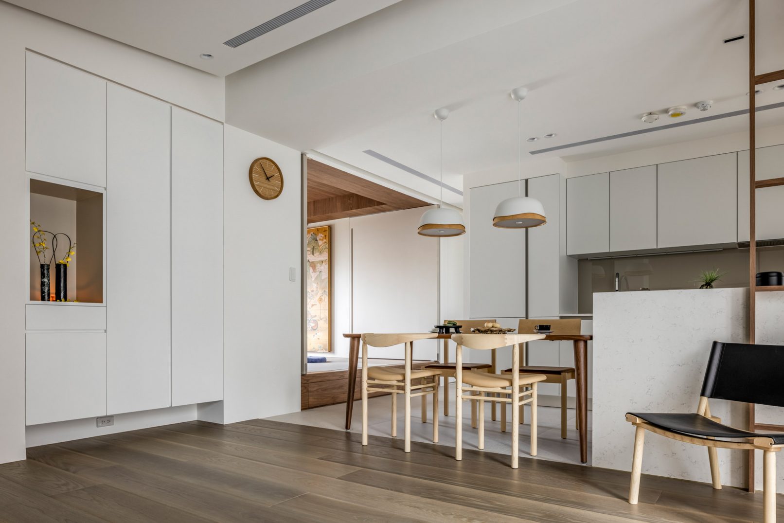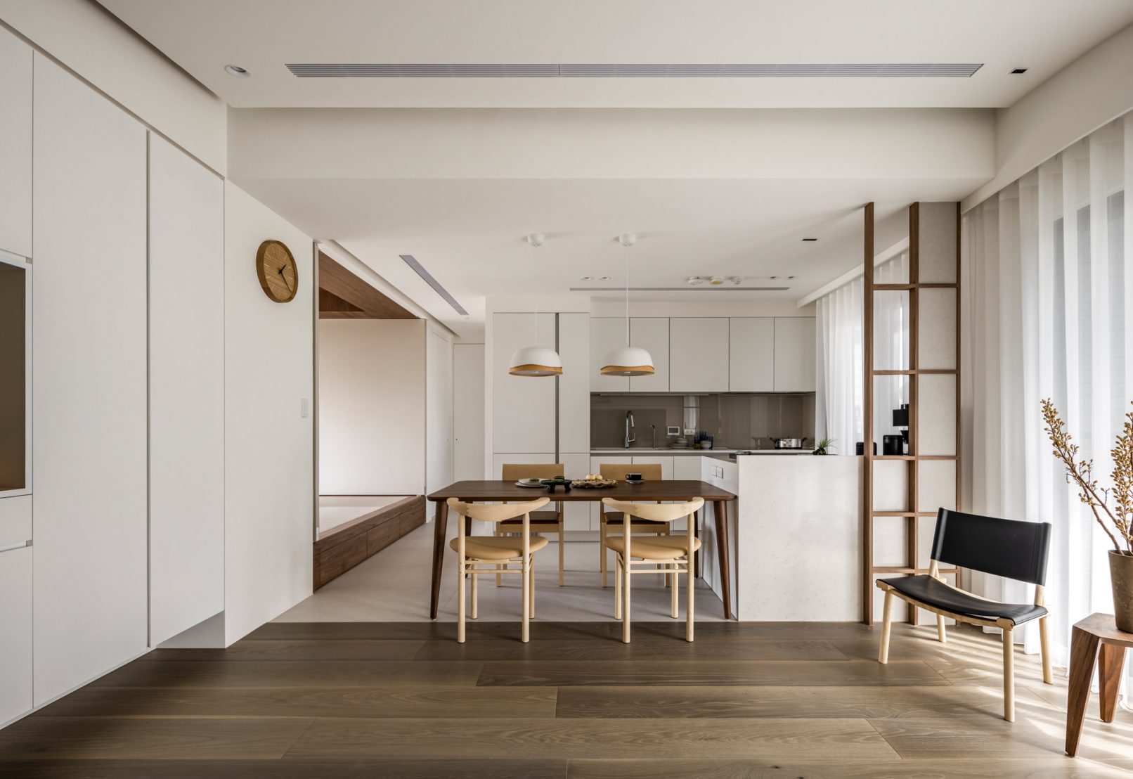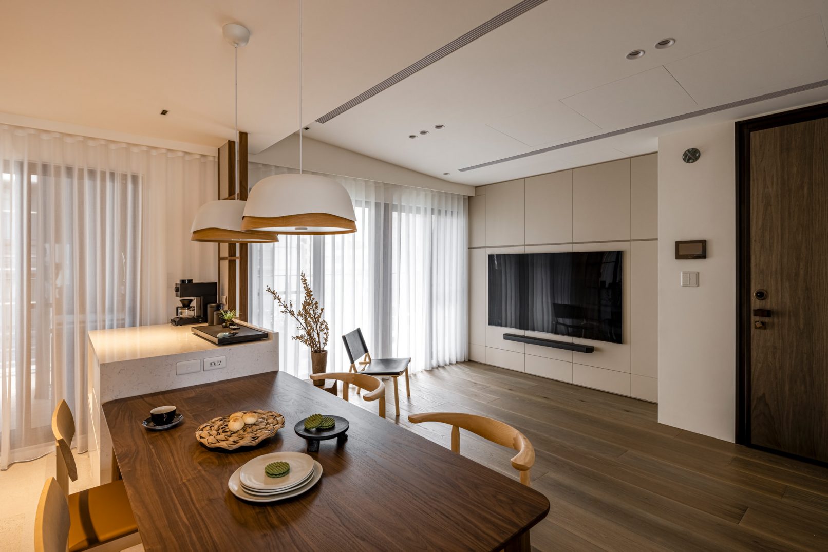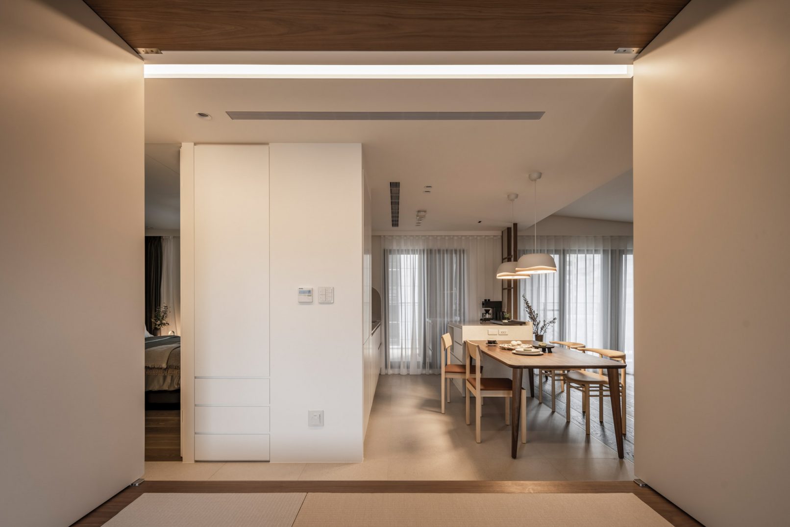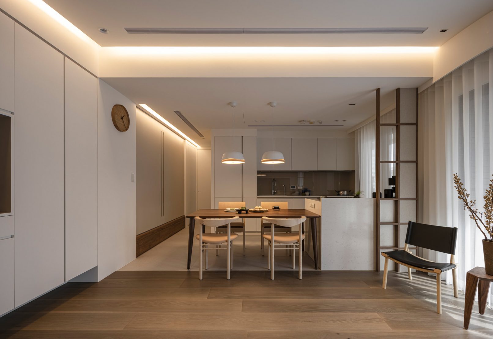預售屋時即進行客變設計,以屋主喜愛的日本文化出發規劃,重整格局。結合高樓層視野優勢,釋出原始一封閉臥室,調整為可彈性開闔的多功能景觀和室,多元使用,也讓更多採光有機會進到公共空間。廁浴則在原位進行微調,讓廁浴分離的同時,引光進廁間,並在浴室放進本來不足空間擺放的獨立浴缸。如同屋主在飲食上重視對食材的純粹,空間的材質配置,也從單純、能感受本質的基調進行,包含寬板且具倒角細節的實木地板、適合有水環境但仍有紋理的木紋磚,擁有自然觸感的天然礦物塗料、和紙席面榻榻米等。位於空間中央的大樑,透過仿若日式屋頂般的斜頂設計修飾,並藉此拉大空間感。軟裝方案則在沈穩的深色胡桃木色調中,以不同形式的典雅藍色,點綴表現屋主開朗性格。家的風景,彷彿人生縮影。品味走過的激情與悠然,越靜越緩、越輕越暖。