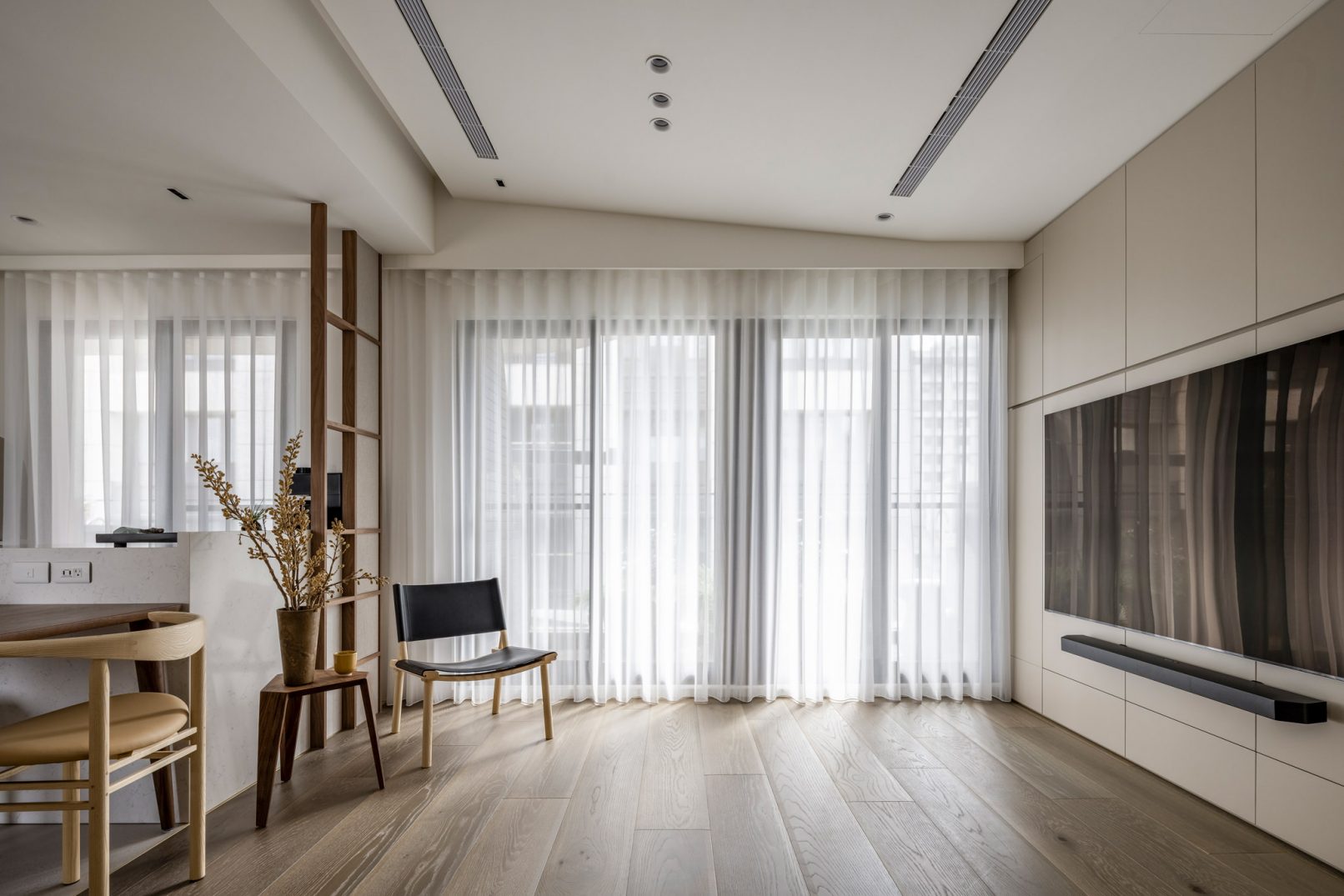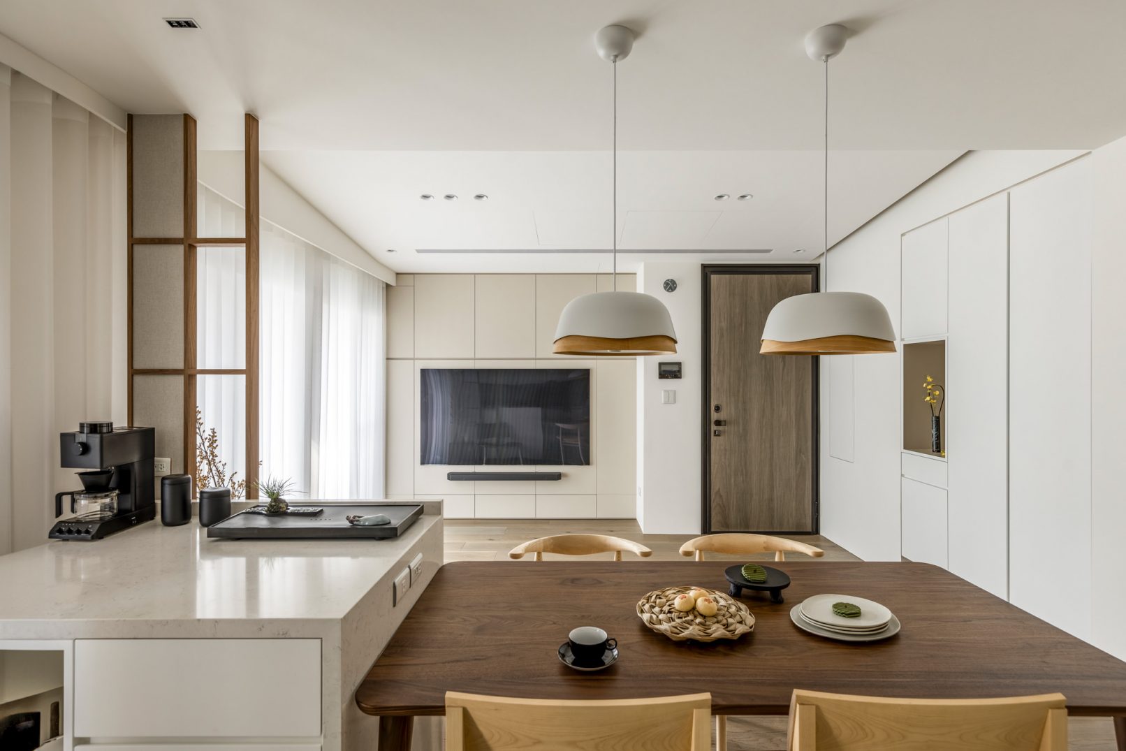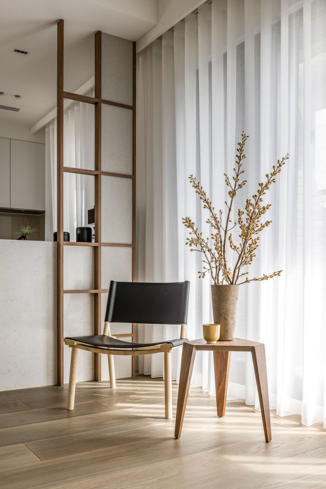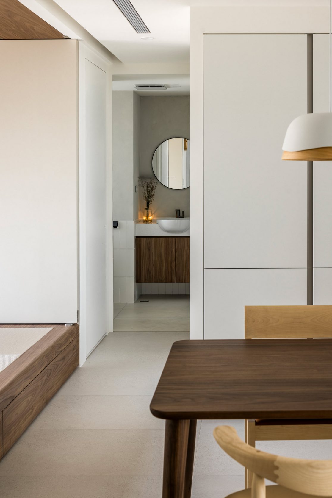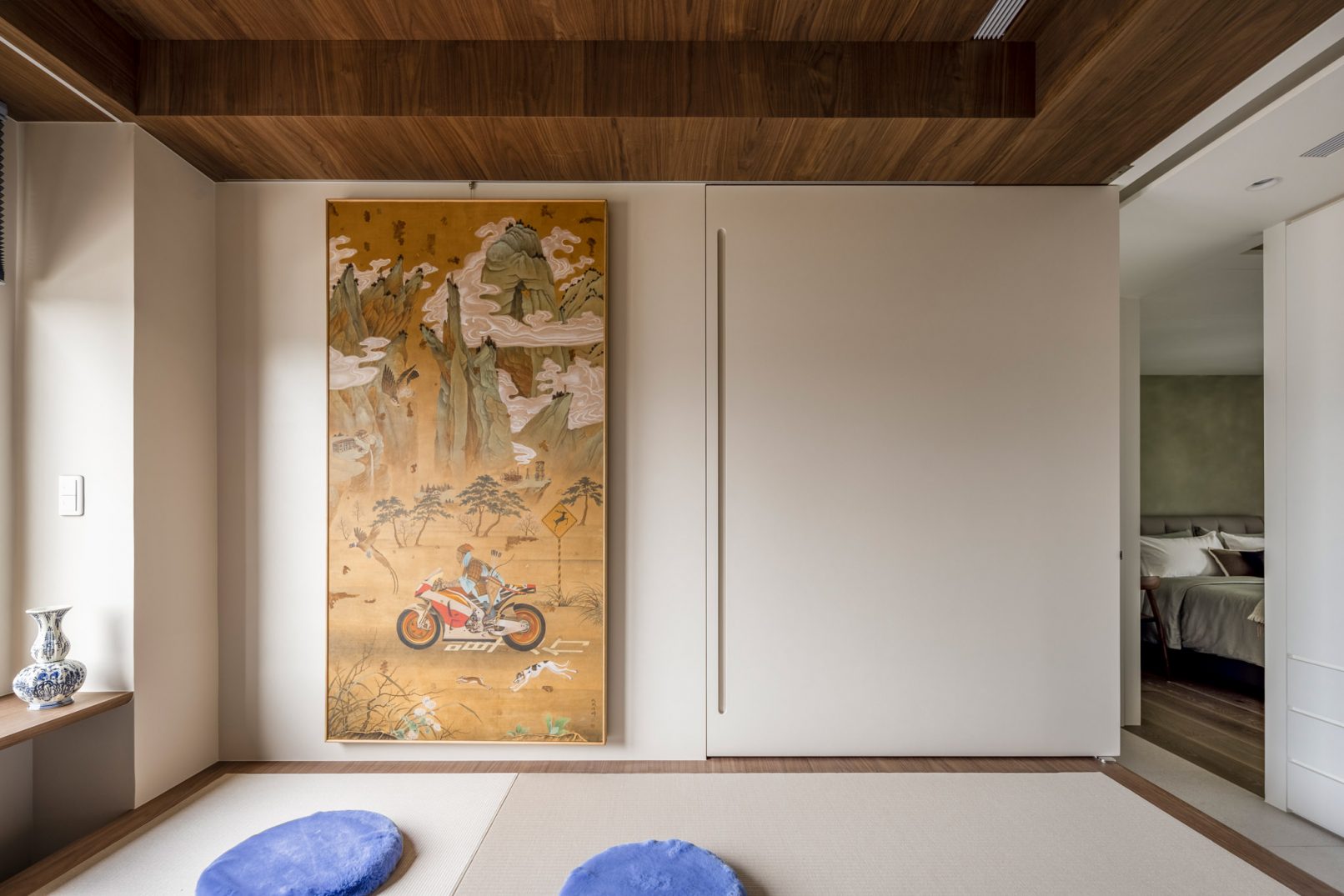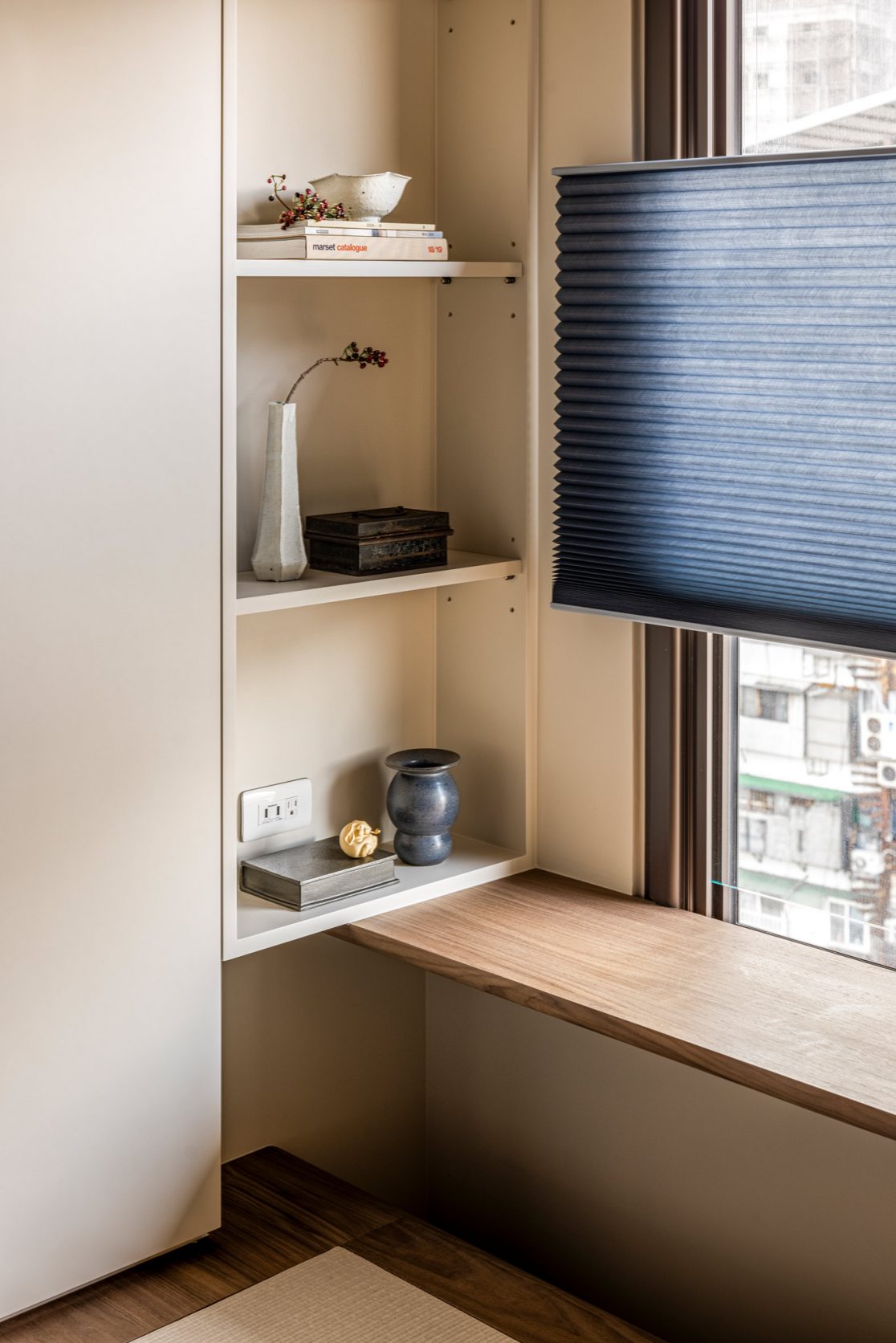 預售屋時即進行客變設計,以屋主喜愛的日本文化出發規劃,重整格局。結合高樓層視野優勢,釋出原始一封閉臥室,調整為可彈性開闔的多功能景觀和室,多元使用,也讓更多採光有機會進到公共空間。廁浴則在原位進行微調,讓廁浴分離的同時,引光進廁間,並在浴室放進本來不足空間擺放的獨立浴缸。如同屋主在飲食上重視對食材的純粹,空間的材質配置,也從單純、能感受本質的基調進行,包含寬板且具倒角細節的實木地板、適合有水環境但仍有紋理的木紋磚,擁有自然觸感的天然礦物塗料、和紙席面榻榻米等。位於空間中央的大樑,透過仿若日式屋頂般的斜頂設計修飾,並藉此拉大空間感。軟裝方案則在沈穩的深色胡桃木色調中,以不同形式的典雅藍色,點綴表現屋主開朗性格。家的風景,彷彿人生縮影。品味走過的激情與悠然,越靜越緩、越輕越暖。