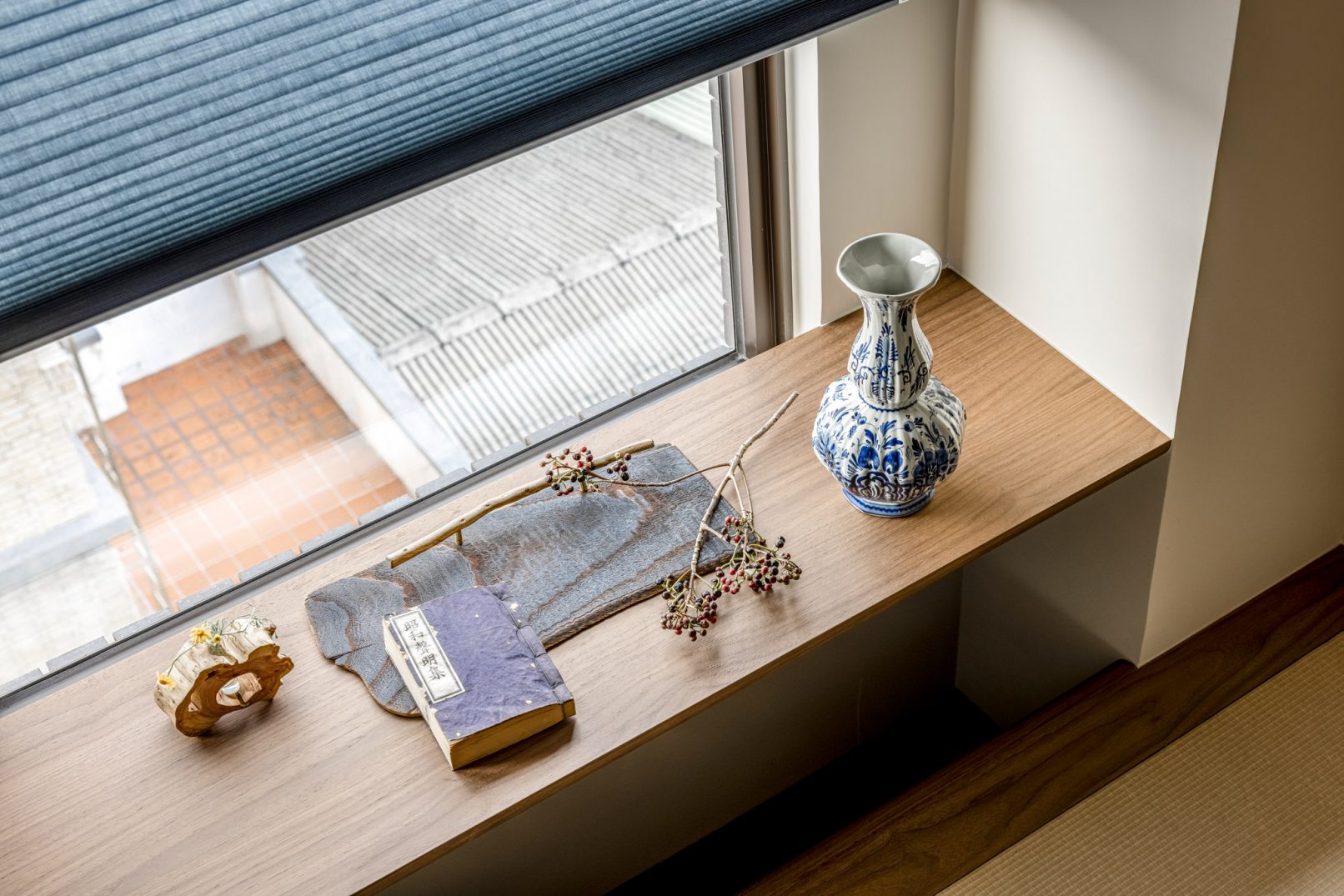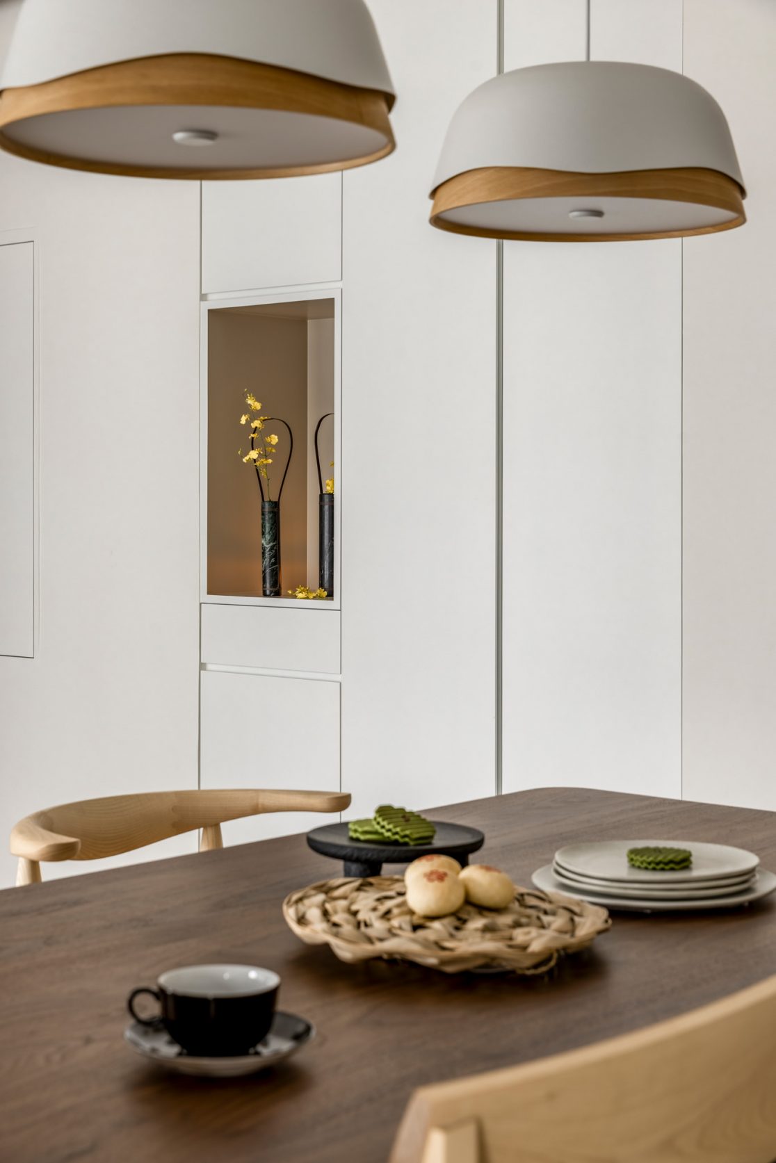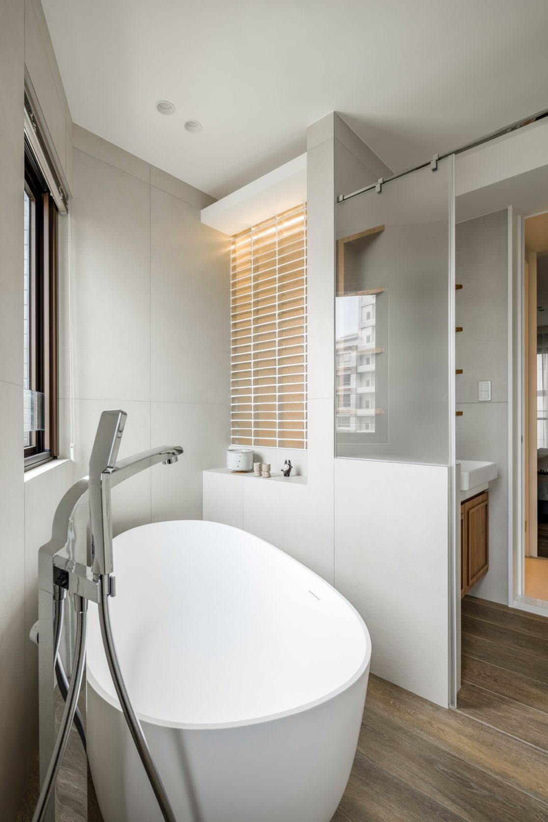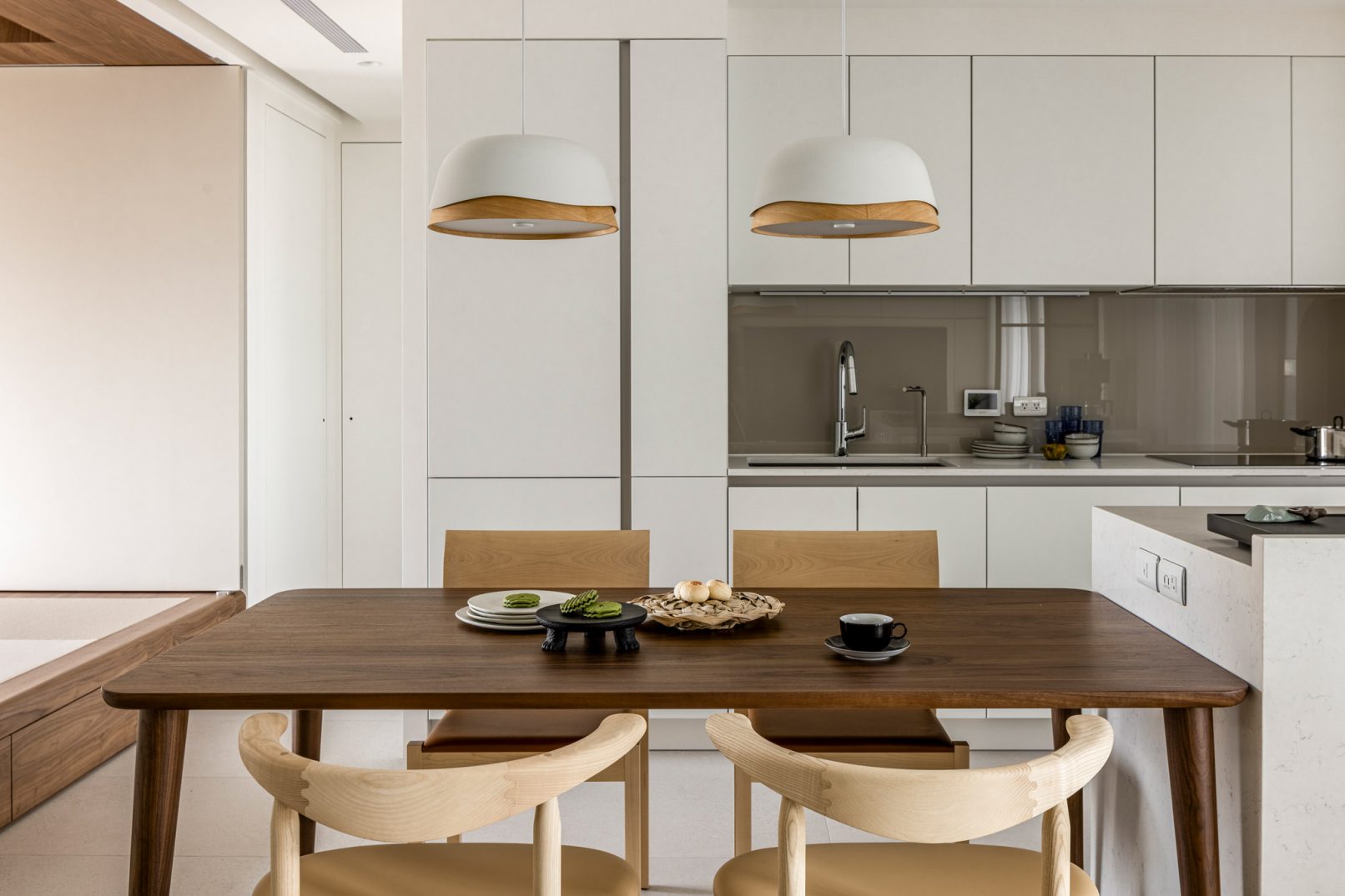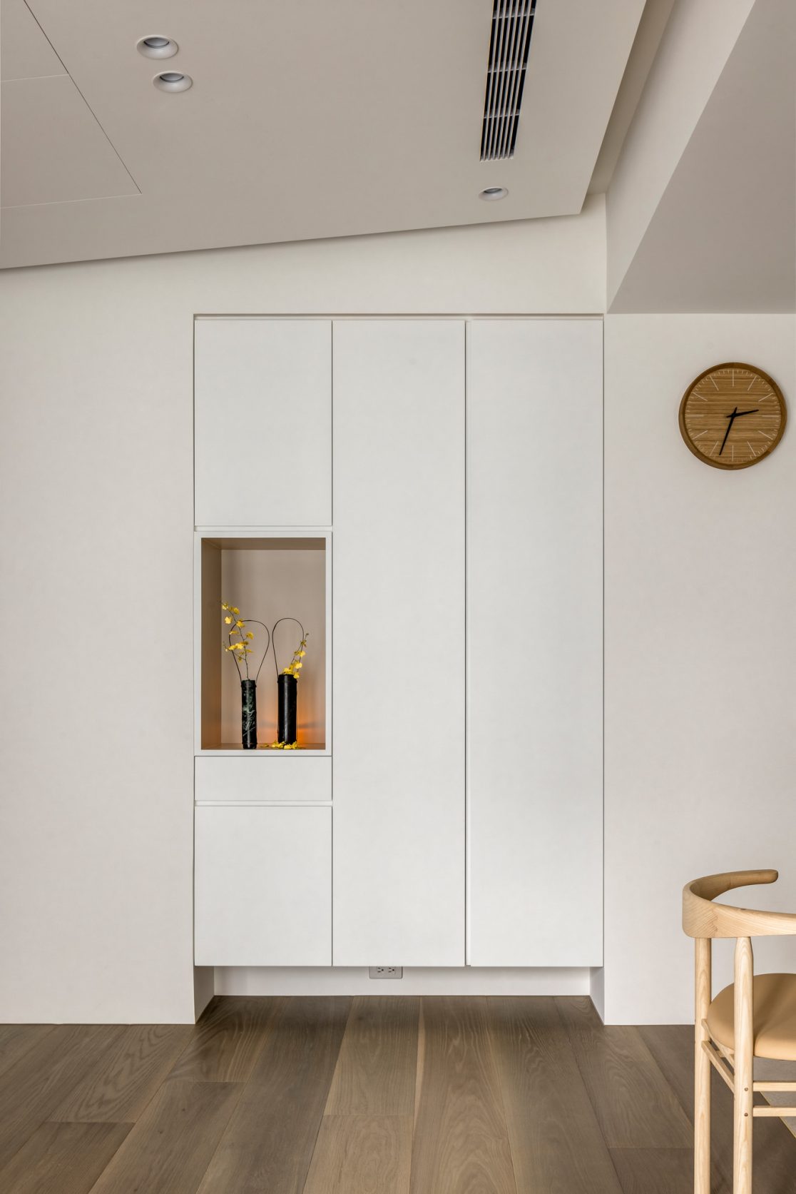 預售屋時即進行客變設計,以屋主喜愛的日本文化出發規劃,重整格局。結合高樓層視野優勢,釋出原始一封閉臥室,調整為可彈性開闔的多功能景觀和室,多元使用,也讓更多採光有機會進到公共空間。廁浴則在原位進行微調,讓廁浴分離的同時,引光進廁間,並在浴室放進本來不足空間擺放的獨立浴缸。如同屋主在飲食上重視對食材的純粹,空間的材質配置,也從單純、能感受本質的基調進行,包含寬板且具倒角細節的實木地板、適合有水環境但仍有紋理的木紋磚,擁有自然觸感的天然礦物塗料、和紙席面榻榻米等。位於空間中央的大樑,透過仿若日式屋頂般的斜頂設計修飾,並藉此拉大空間感。軟裝方案則在沈穩的深色胡桃木色調中,以不同形式的典雅藍色,點綴表現屋主開朗性格。家的風景,彷彿人生縮影。品味走過的激情與悠然,越靜越緩、越輕越暖。
