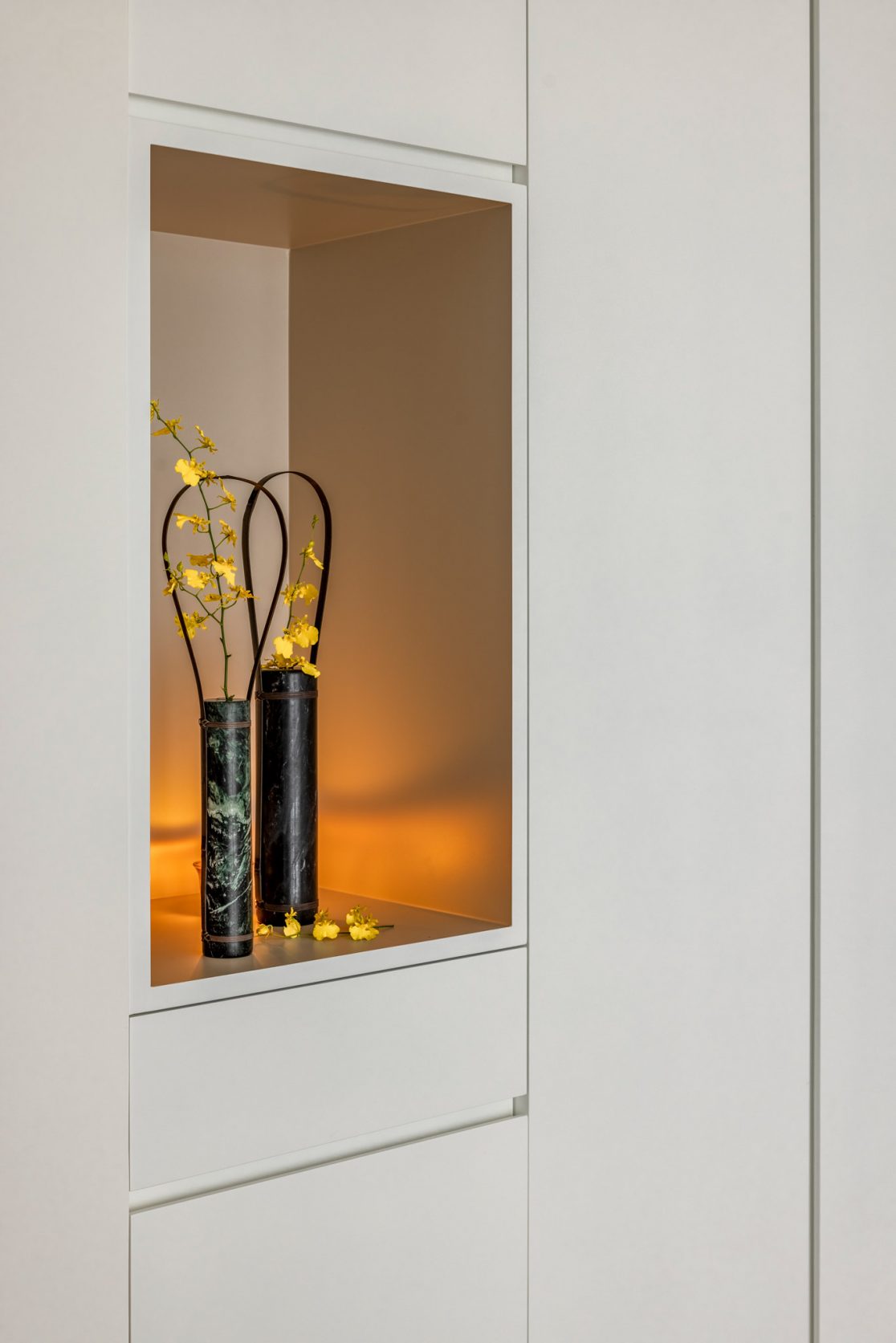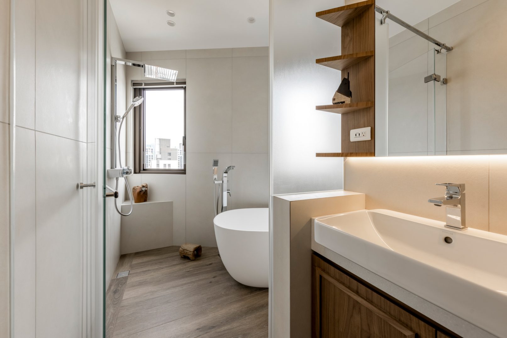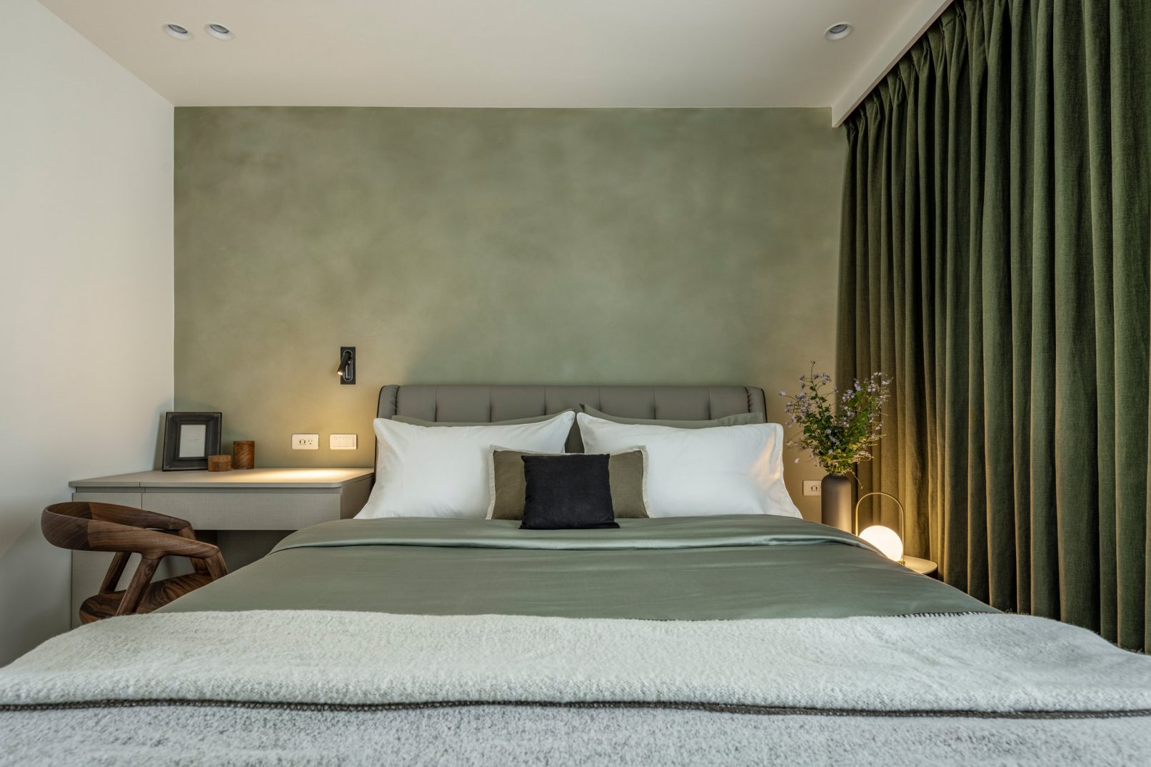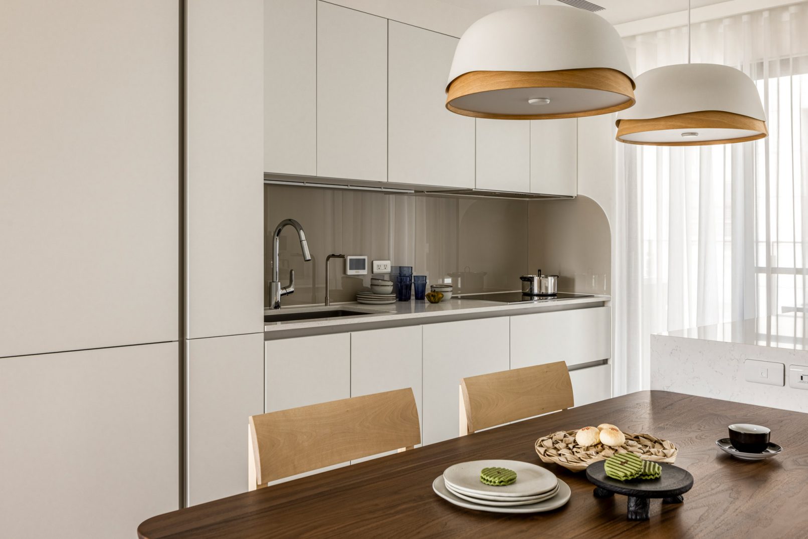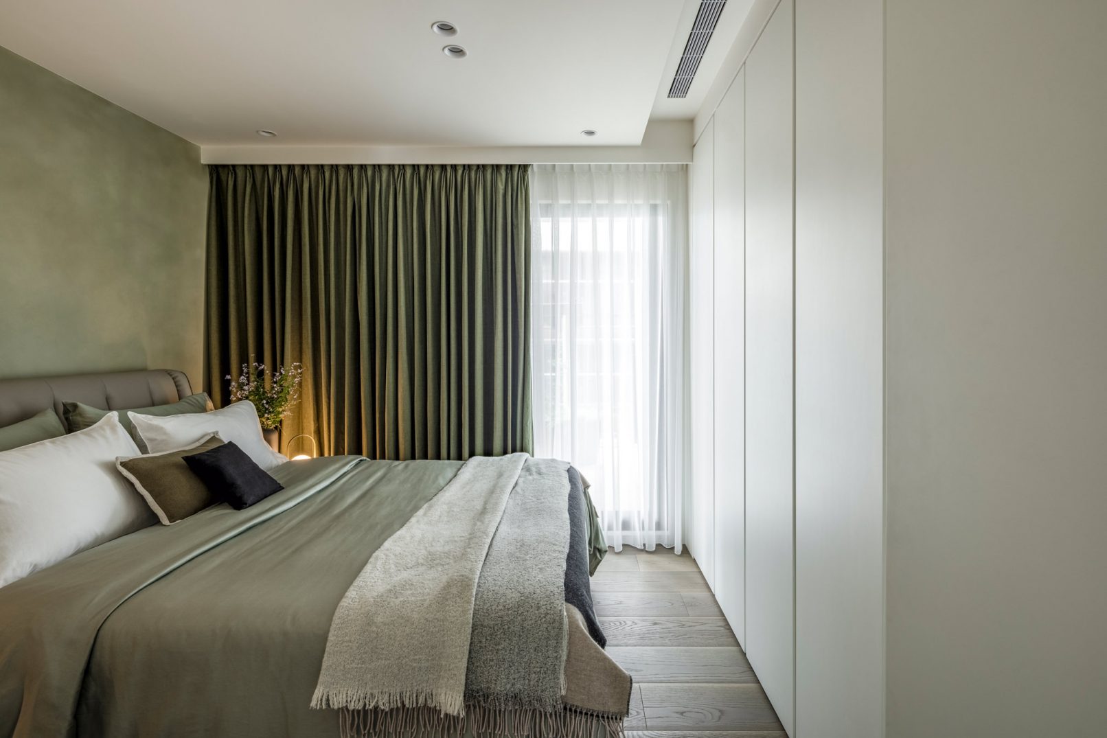 預售屋時即進行客變設計,以屋主喜愛的日本文化出發規劃,重整格局。結合高樓層視野優勢,釋出原始一封閉臥室,調整為可彈性開闔的多功能景觀和室,多元使用,也讓更多採光有機會進到公共空間。廁浴則在原位進行微調,讓廁浴分離的同時,引光進廁間,並在浴室放進本來不足空間擺放的獨立浴缸。如同屋主在飲食上重視對食材的純粹,空間的材質配置,也從單純、能感受本質的基調進行,包含寬板且具倒角細節的實木地板、適合有水環境但仍有紋理的木紋磚,擁有自然觸感的天然礦物塗料、和紙席面榻榻米等。位於空間中央的大樑,透過仿若日式屋頂般的斜頂設計修飾,並藉此拉大空間感。軟裝方案則在沈穩的深色胡桃木色調中,以不同形式的典雅藍色,點綴表現屋主開朗性格。家的風景,彷彿人生縮影。品味走過的激情與悠然,越靜越緩、越輕越暖。