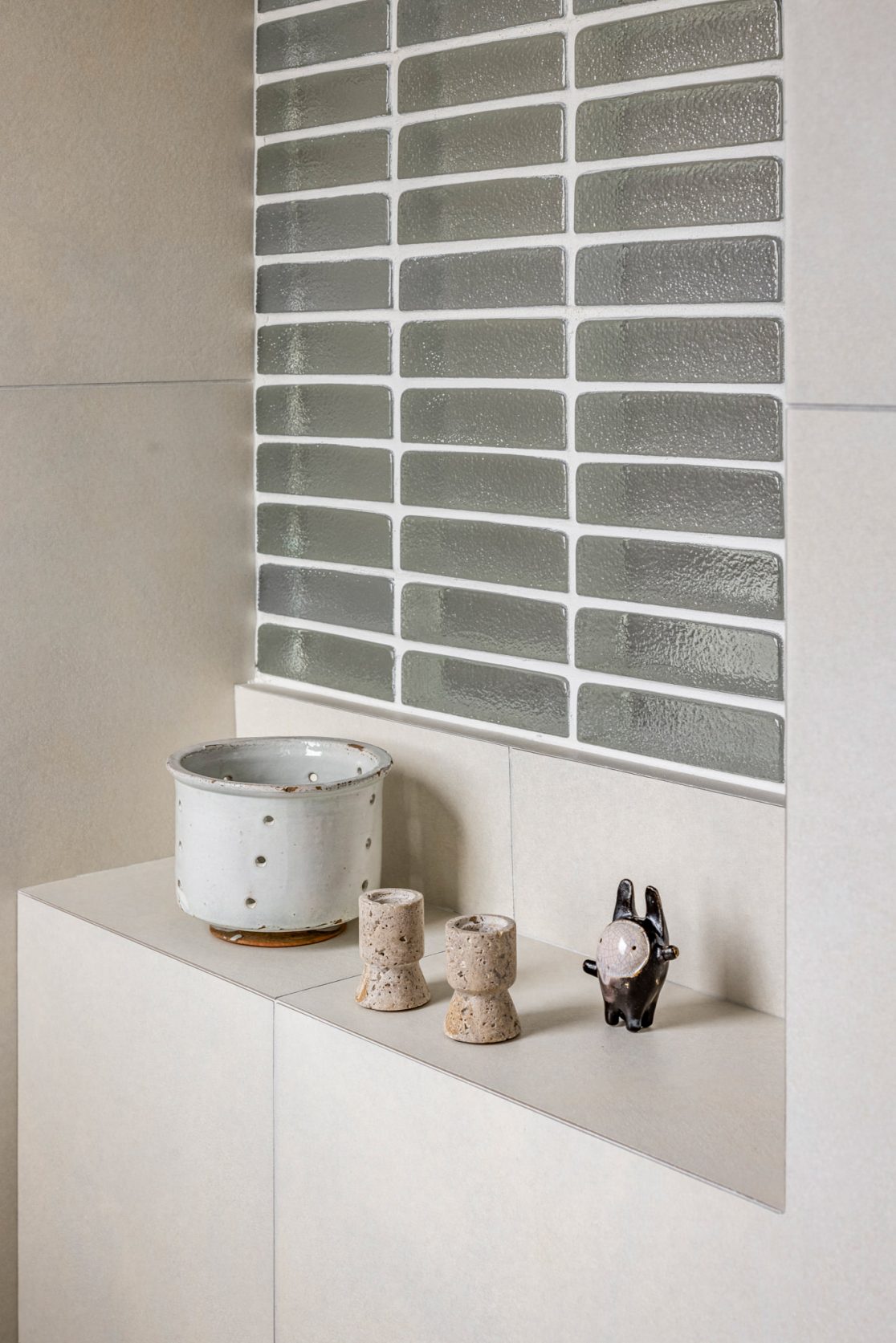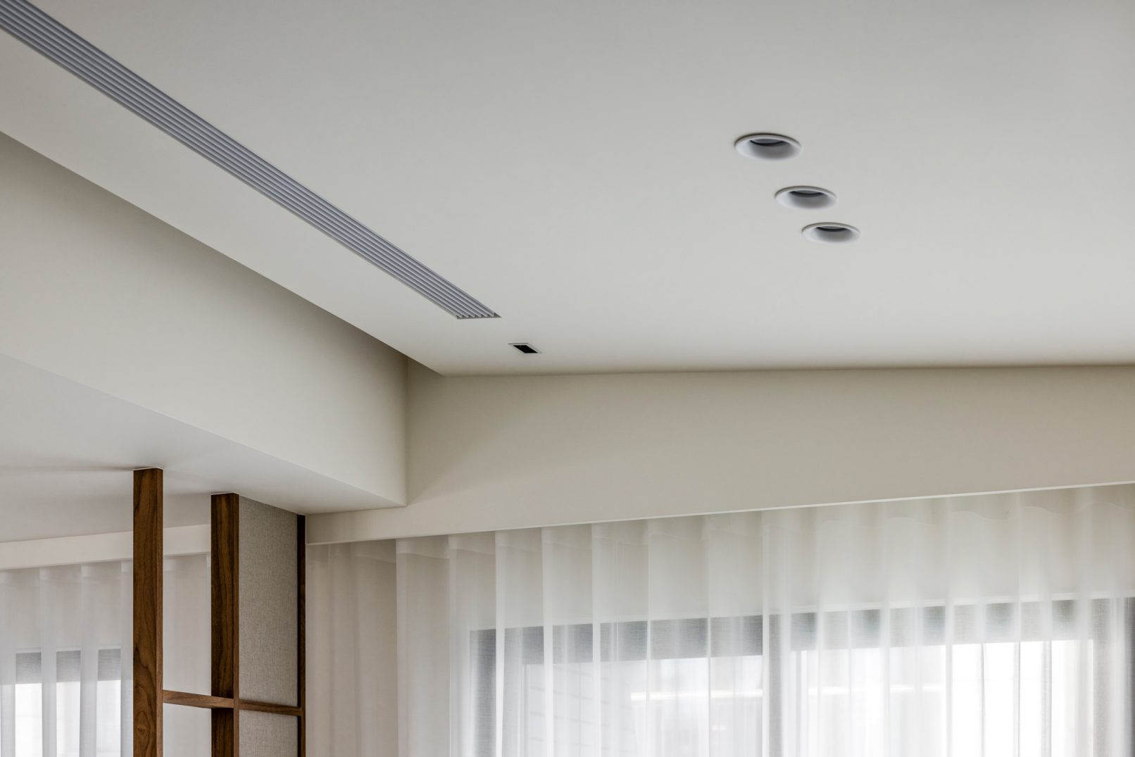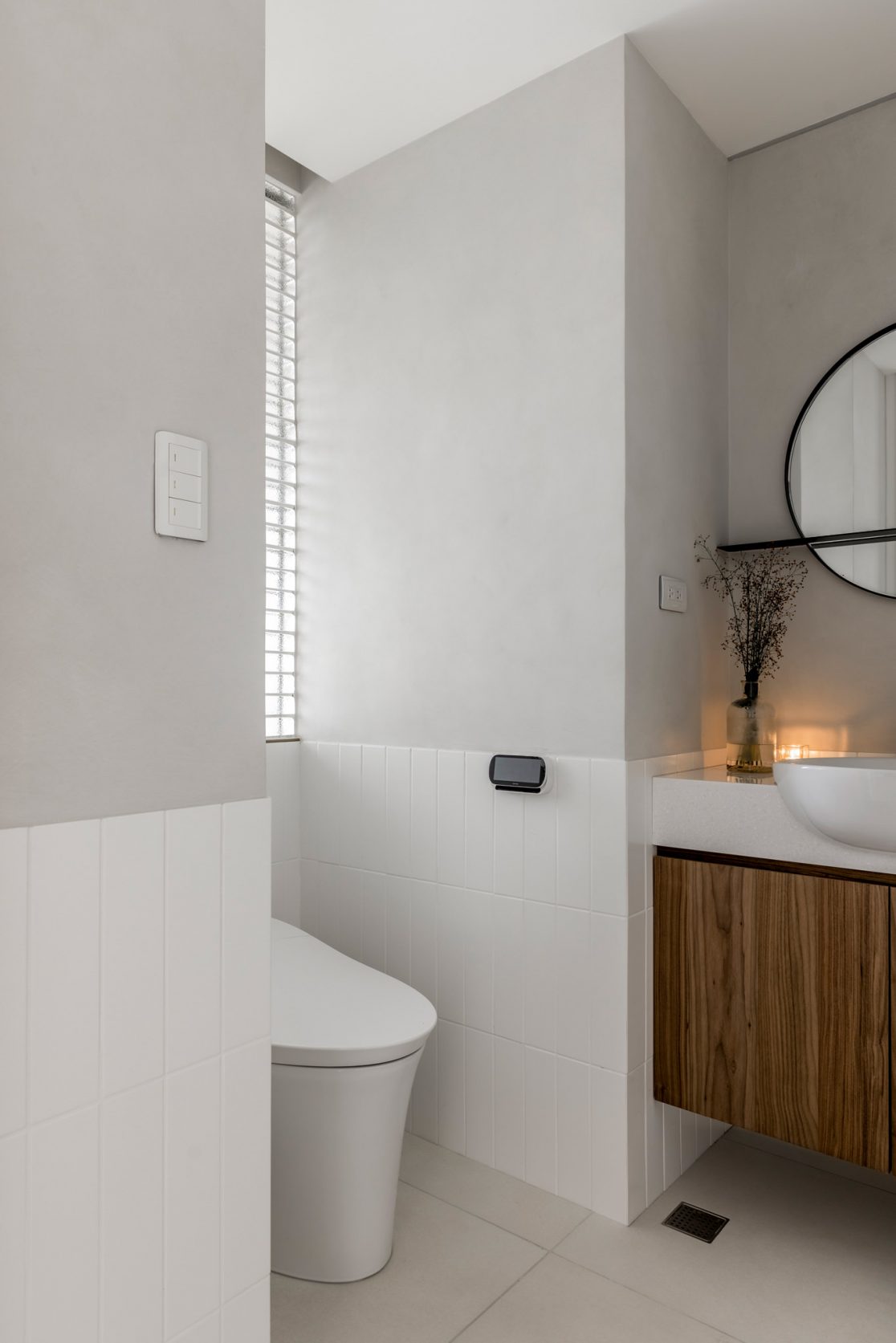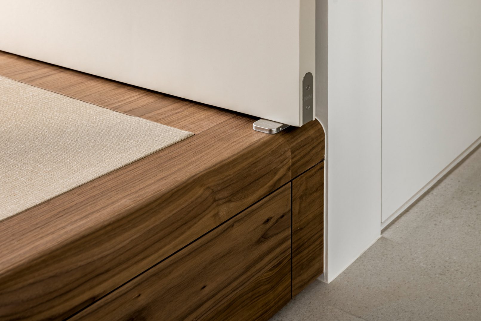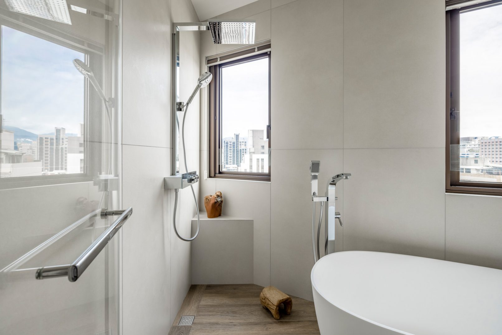預售屋時即進行客變設計,以屋主喜愛的日本文化出發規劃,重整格局。結合高樓層視野優勢,釋出原始一封閉臥室,調整為可彈性開闔的多功能景觀和室,多元使用,也讓更多採光有機會進到公共空間。廁浴則在原位進行微調,讓廁浴分離的同時,引光進廁間,並在浴室放進本來不足空間擺放的獨立浴缸。如同屋主在飲食上重視對食材的純粹,空間的材質配置,也從單純、能感受本質的基調進行,包含寬板且具倒角細節的實木地板、適合有水環境但仍有紋理的木紋磚,擁有自然觸感的天然礦物塗料、和紙席面榻榻米等。位於空間中央的大樑,透過仿若日式屋頂般的斜頂設計修飾,並藉此拉大空間感。軟裝方案則在沈穩的深色胡桃木色調中,以不同形式的典雅藍色,點綴表現屋主開朗性格。家的風景,彷彿人生縮影。品味走過的激情與悠然,越靜越緩、越輕越暖。